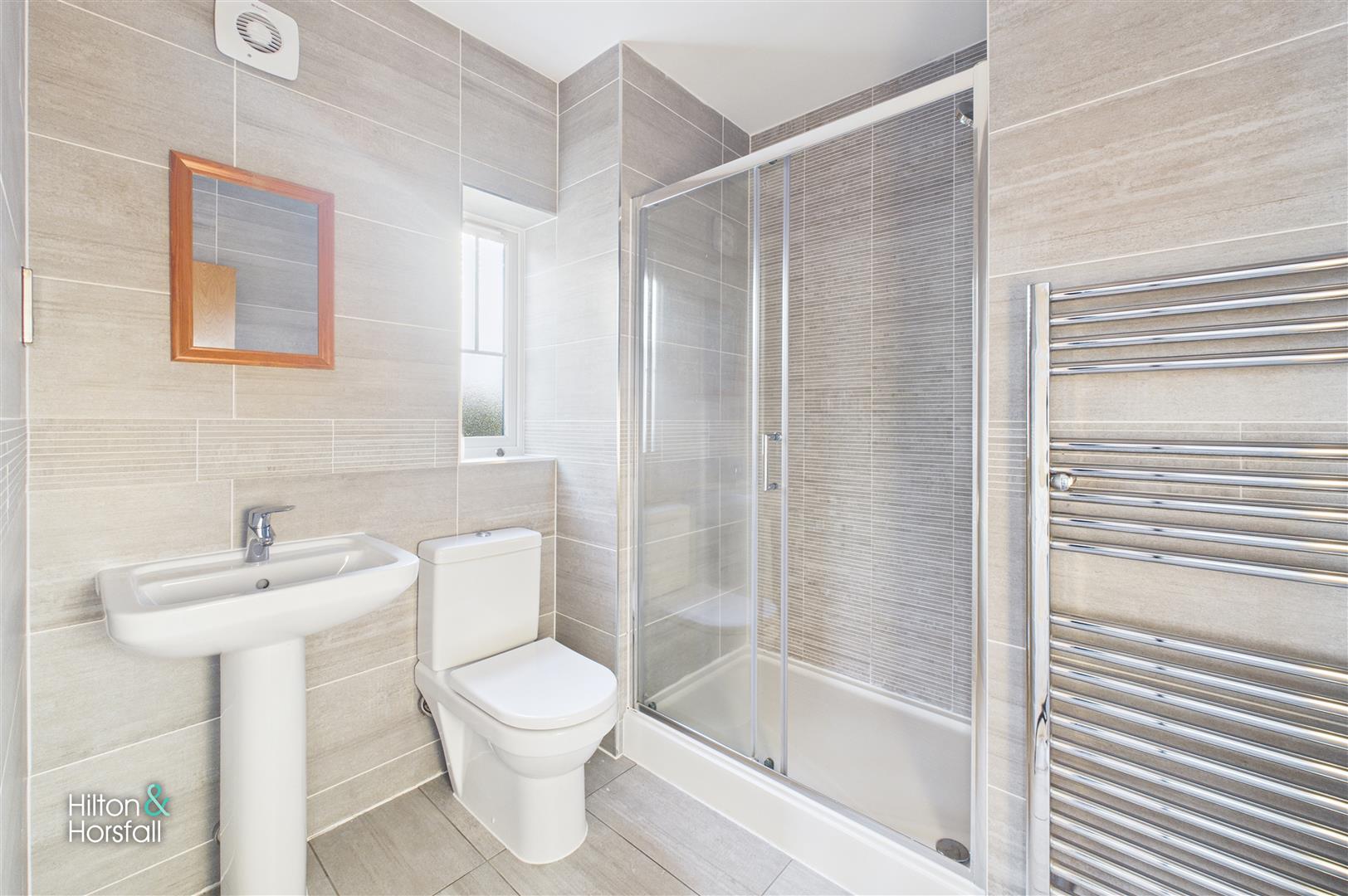 A modern en suite shower room fitted with a three-piece suite comprising a shower enclosure, low-level WC and pedestal wash hand basin, finished with contemporary tiling and a heated towel rail.