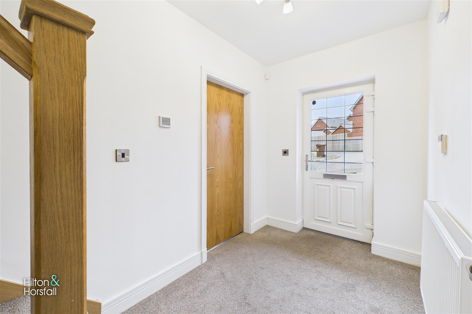 A bright and welcoming entrance hallway finished in neutral décor with a fitted carpet. The space provides access to the main ground floor rooms and features a staircase leading to the first floor with wooden balustrade detailing, along with a radiator for warmth.
