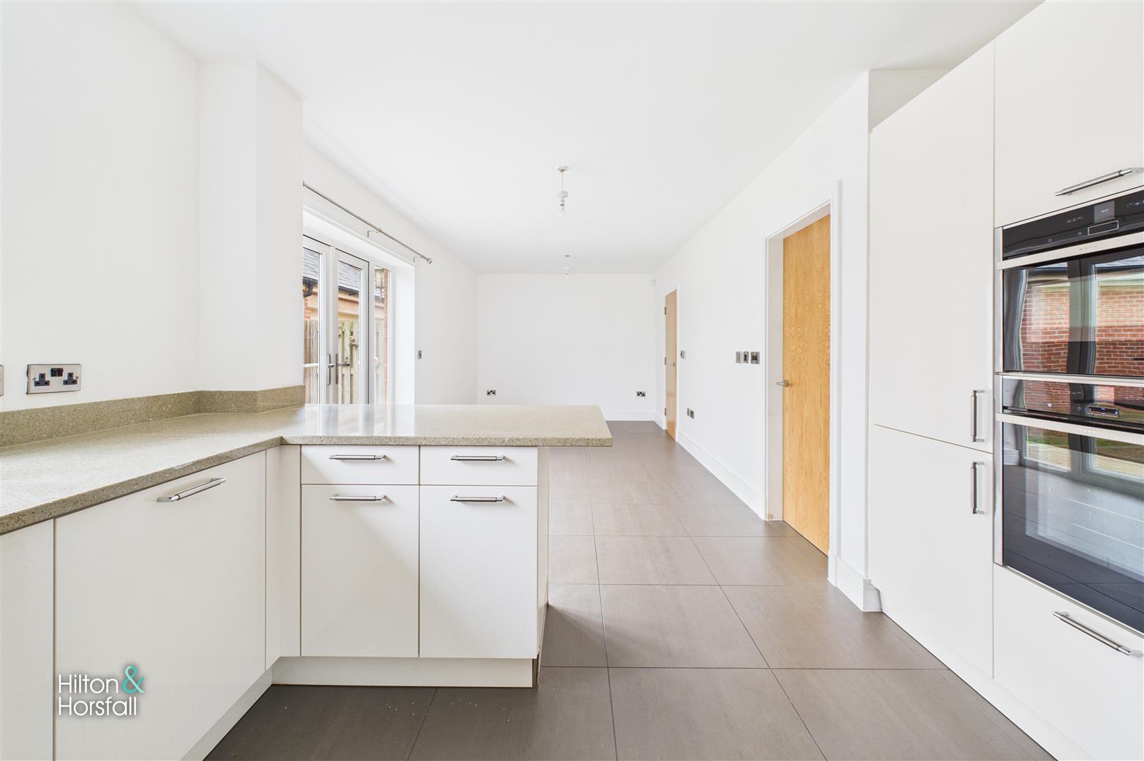 A modern and spacious dining kitchen fitted with a range of contemporary units, integrated appliances and complementary work surfaces. The room offers ample space for dining and entertaining, finished with tiled flooring and enjoying French doors opening out to the rear garden, creating an excellent indoor-outdoor flow.