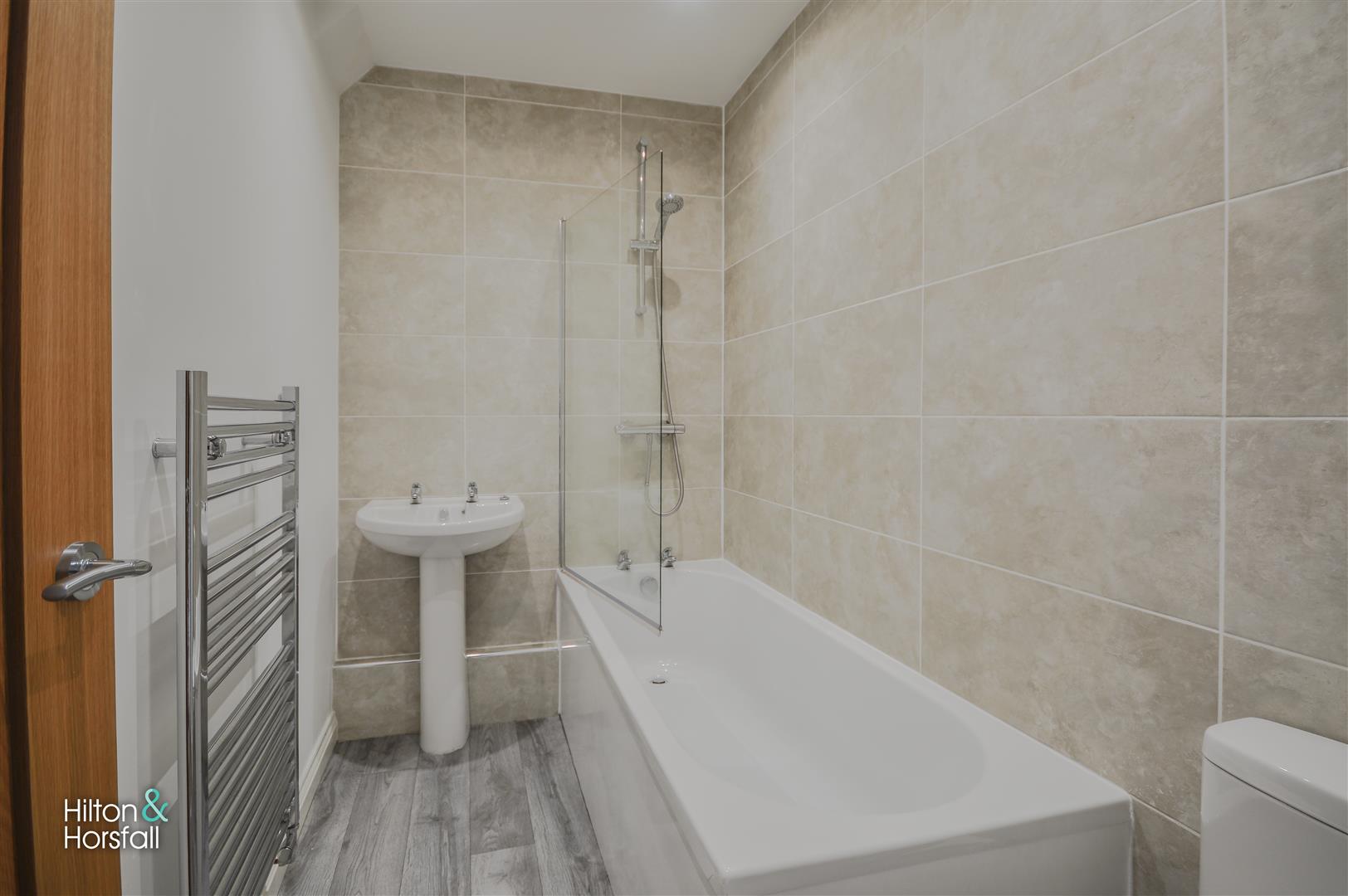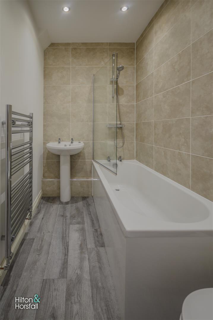 A three piece white bathroom suite with a low level push button W.C., panelled bath tub with shower over and glass shower screen, chrome heated towel radiator, pedestal hand basin and tiled walls & flooring.