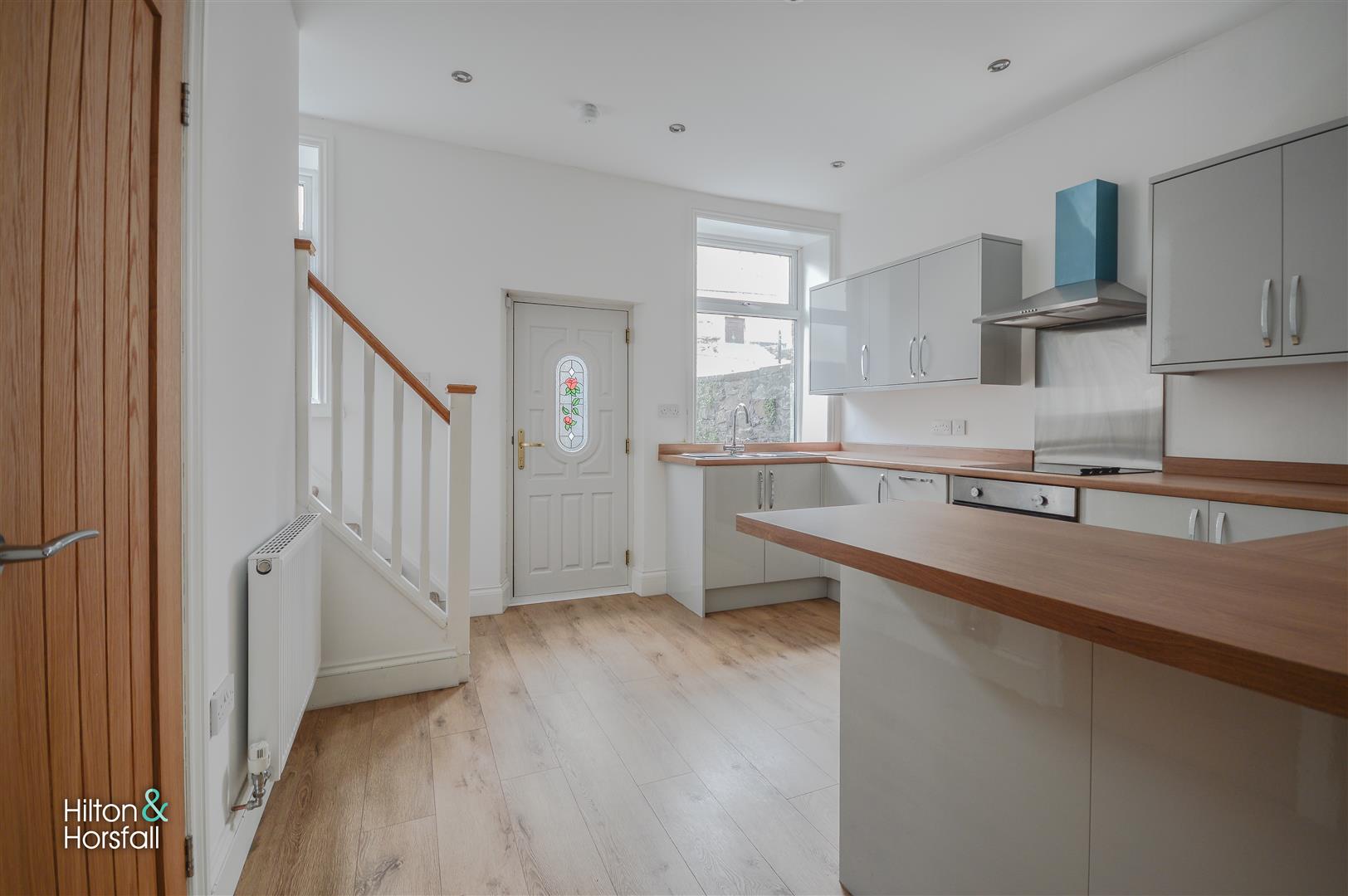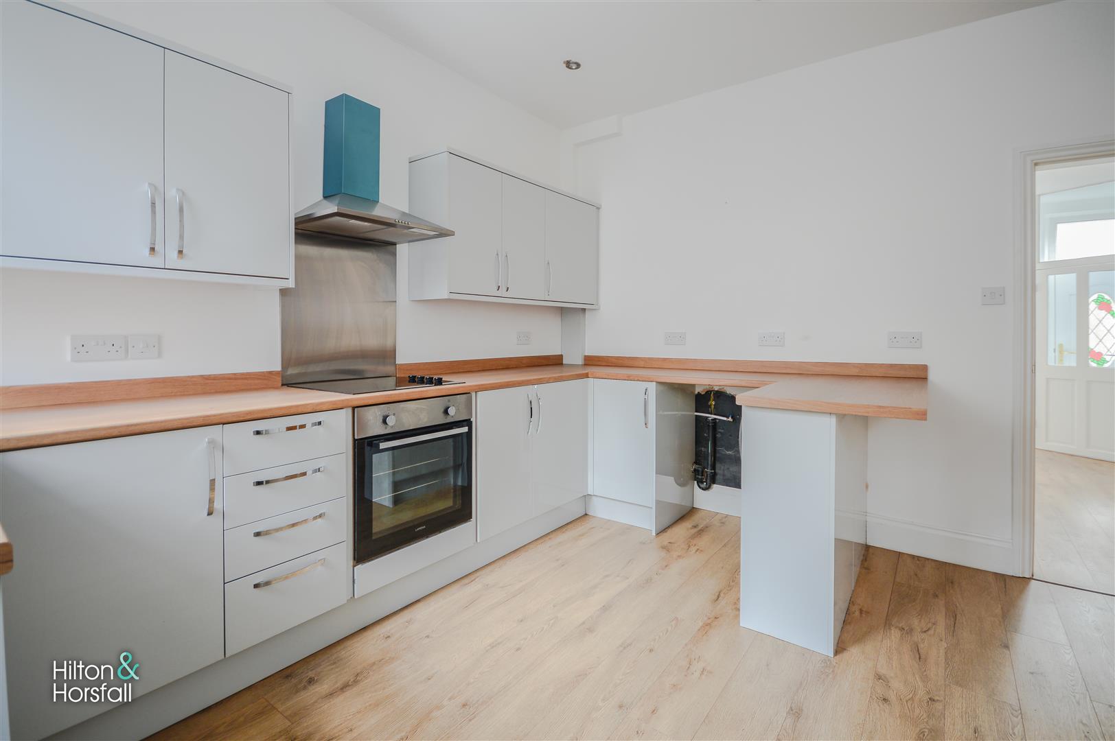 A modern kitchen with a range of fitted wall and base units with contrasting work surface over, a breakfast bar, Lamona oven with electric hob and extraction hood over, Lamona double stainless steel sink and drainer, plumbing for a washing machine, two uPVC double glazed window units, radiator and under stair storage.