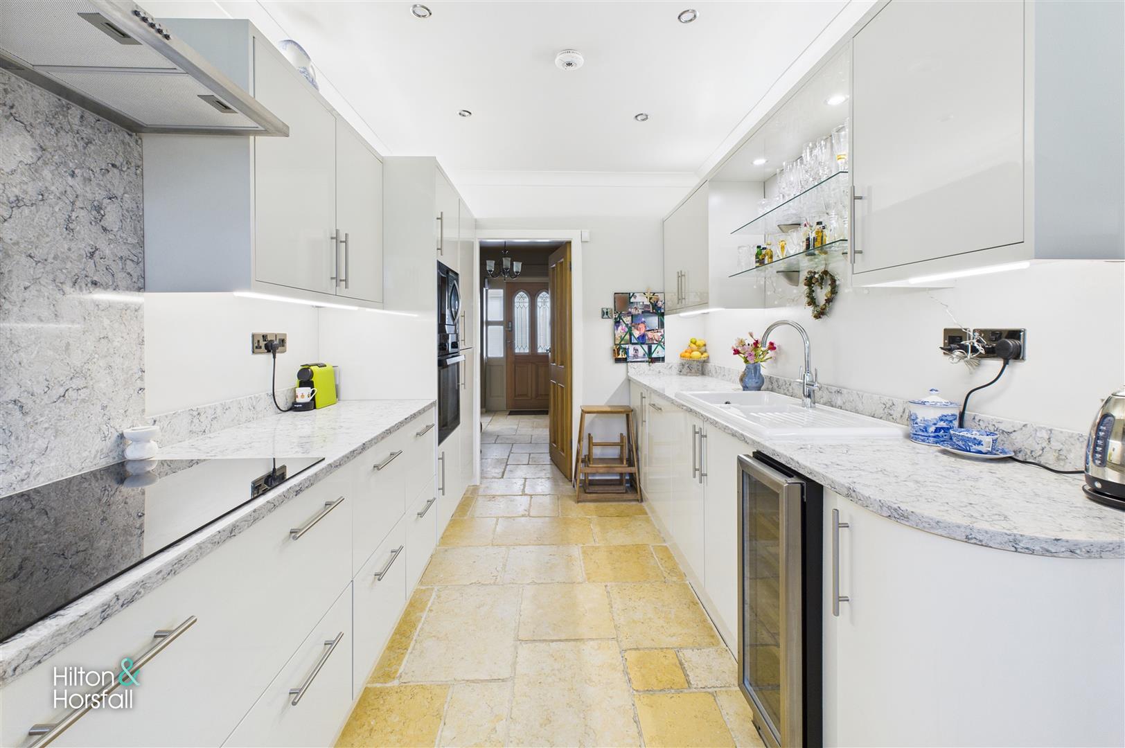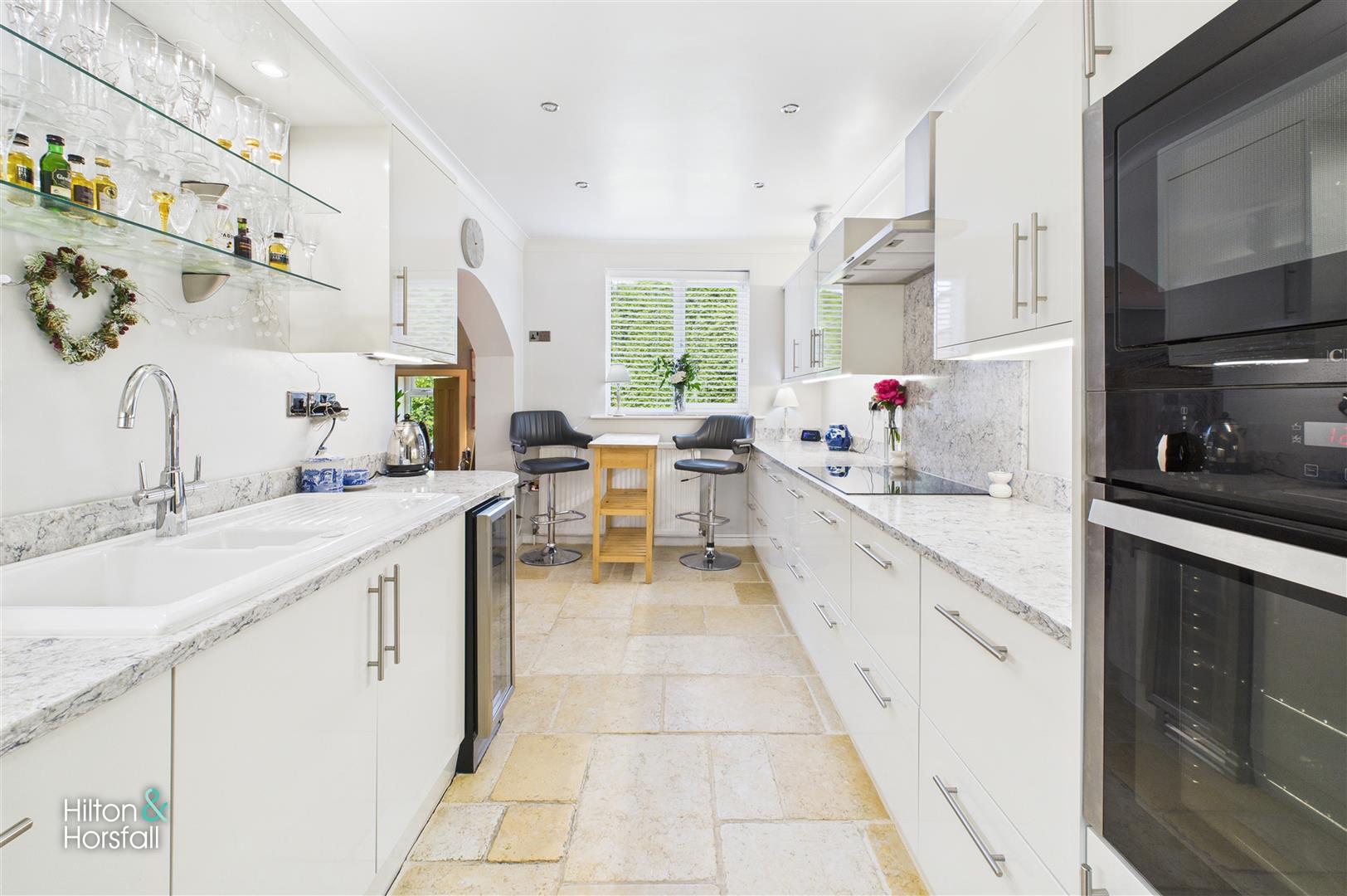 A modern fitted kitchen with a range of wall and base units, having integrated appliances such as a five ring induction hob, oven, microwave, extractor hood, wine cooler and dishwasher. The kitchen also boasts a white ceramic sink with chrome hot and cold taps, Silestone Pietra Quartz work tops, 1x radiator, LED spotlights, coving, stone flooring and a uPVC double glazed window to the rear elevation.