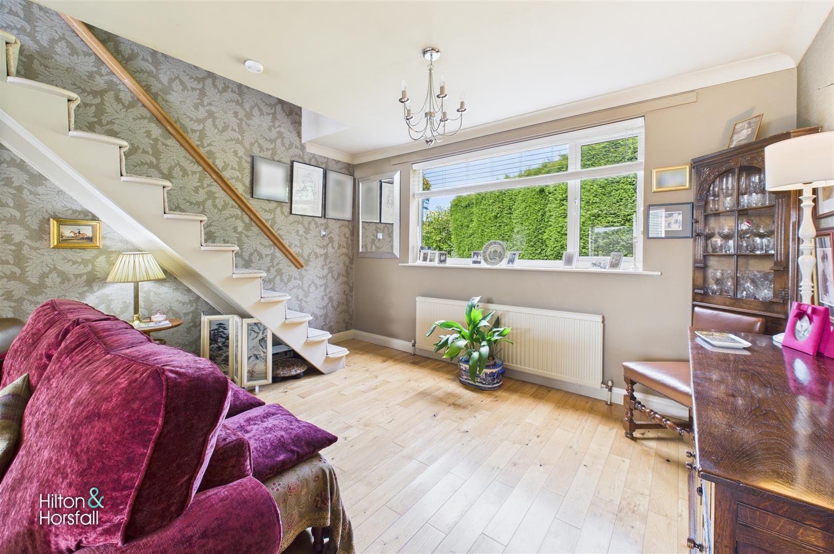 A large dining room with solid oak flooring, 2x radiators, a uPVC double glazed window to the rear elevation and uPVC sliding doors leading to the sun room.
