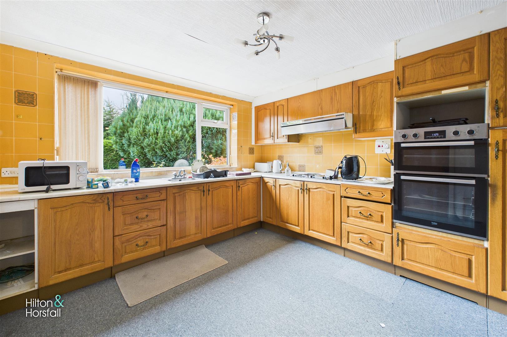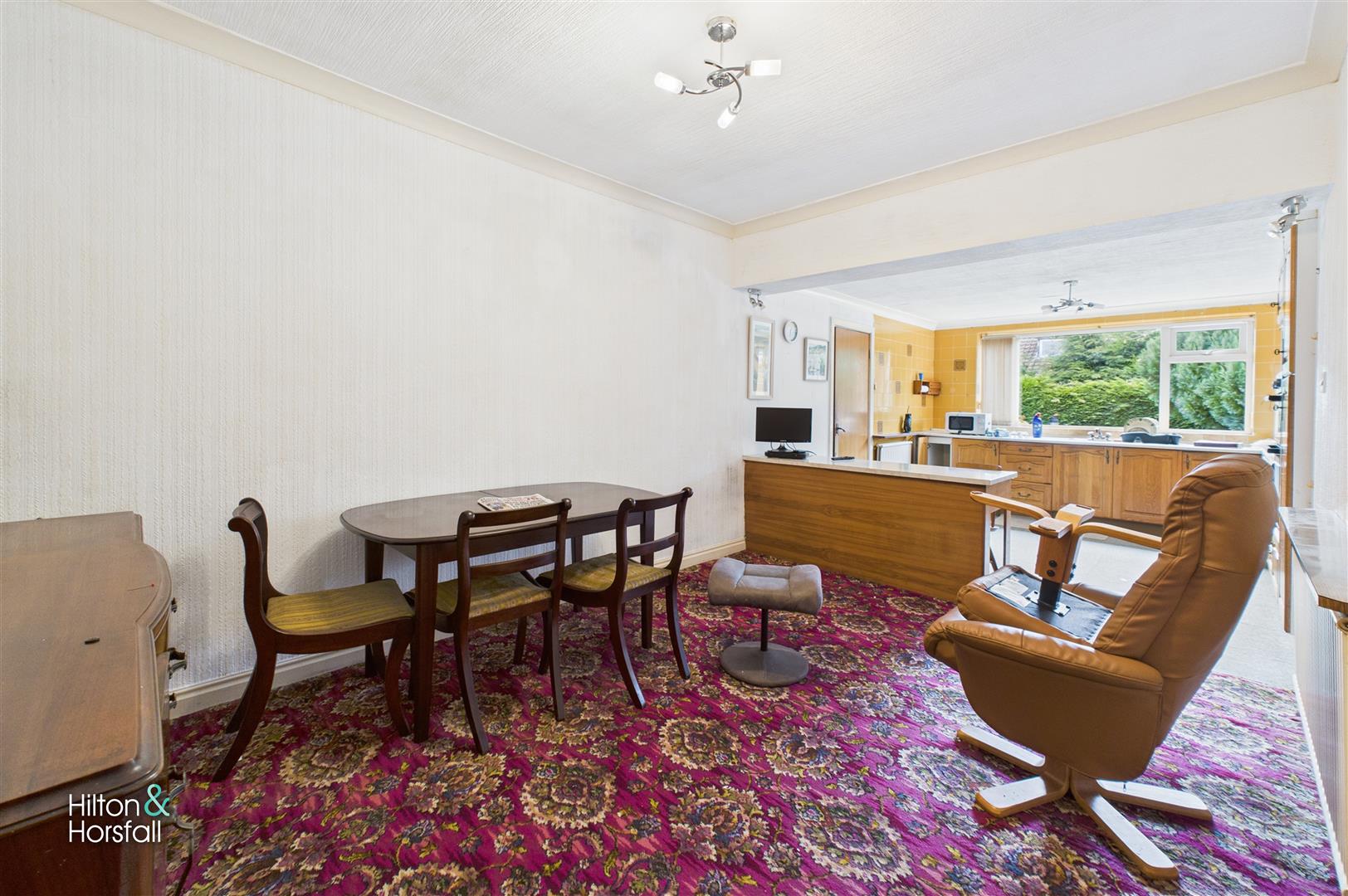 A spacious open-plan dining kitchen stretching the full width of the property, offering a fantastic amount of versatility. The kitchen area is fitted with a range of traditional wall and base units with complementary work surfaces, a built-in double oven, gas hob, and sink positioned beneath a large window overlooking the rear garden. There’s ample space for a family dining table and seating area, making this an ideal space for everyday living and entertaining. A door provides access to the utility room and ground floor W.C., while a large picture window allows natural light to fill the room.