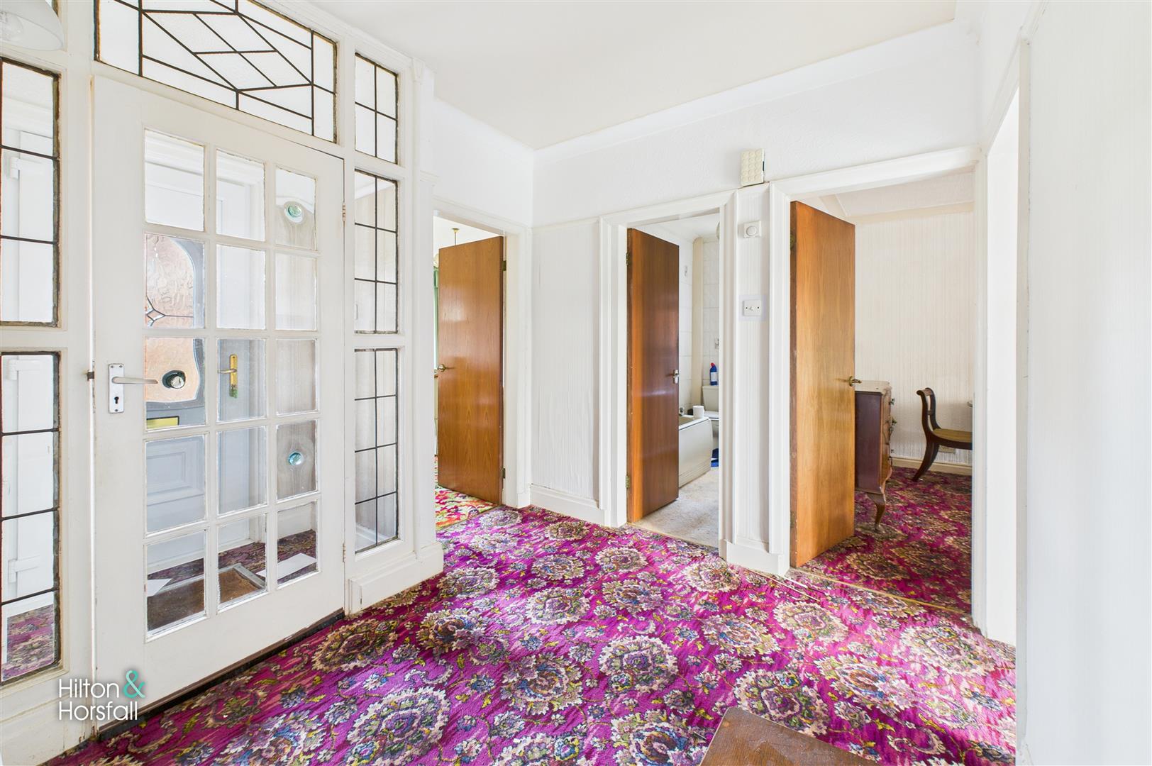A welcoming entrance hallway featuring a glazed internal door with decorative glass panels, allowing natural light to flow through the space. The hallway provides access to the main living areas, bedrooms, and bathroom, offering a practical layout throughout this well-proportioned bungalow.