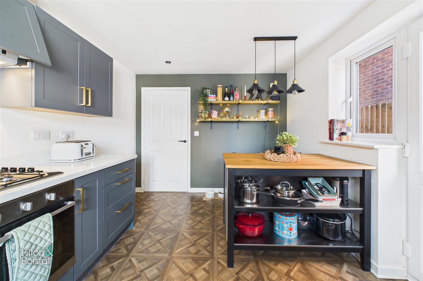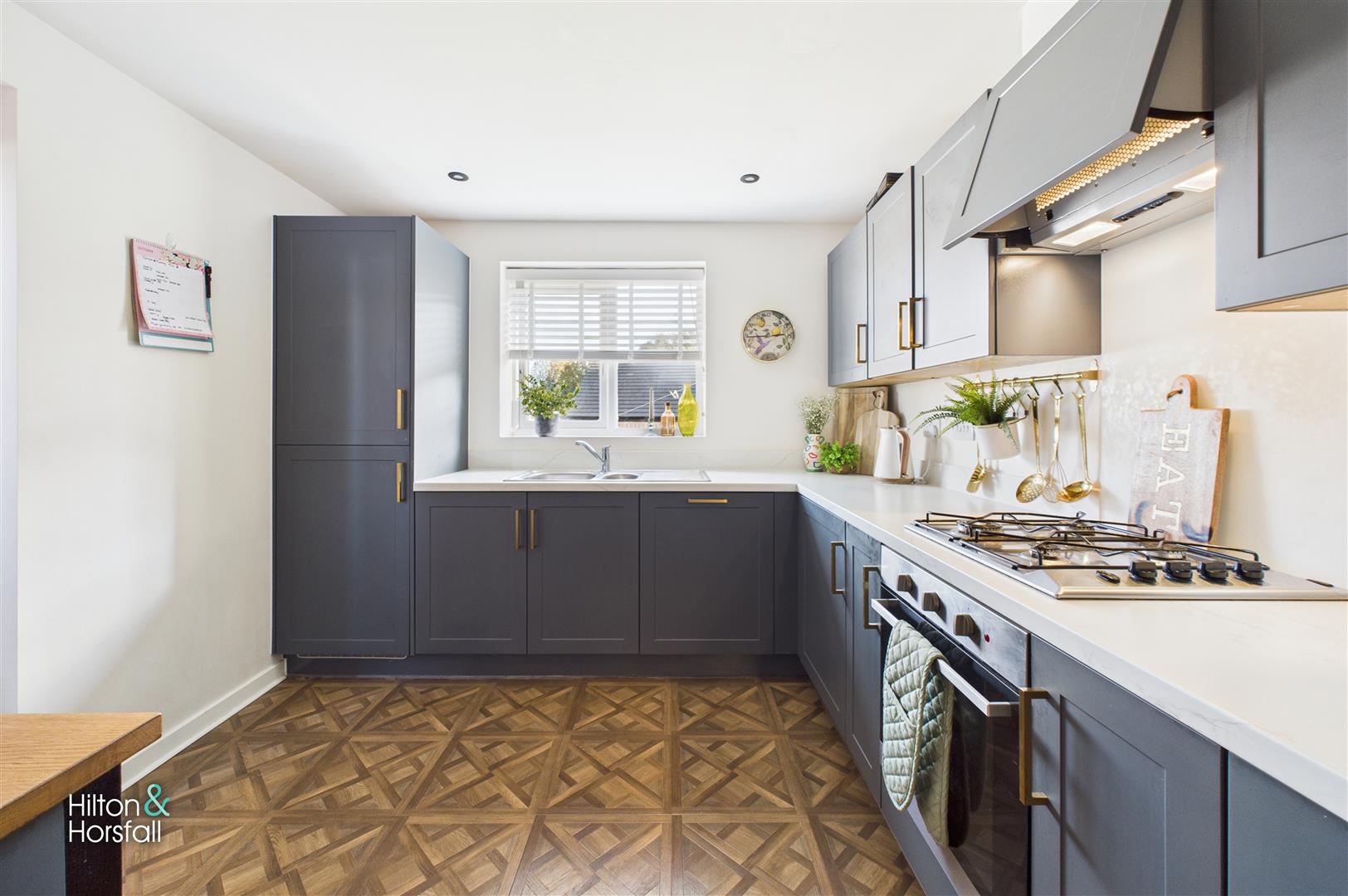 A stylish and contemporary space fitted with a range of sleek grey shaker-style units, contrasting brass handles, and white work surfaces. This impressive kitchen offers integrated appliances, ample storage, and a designated breakfast area perfect for casual dining. Dual aspect windows and a rear door provide plenty of natural light and access to the garden, creating a bright, airy, and social hub for everyday family life.