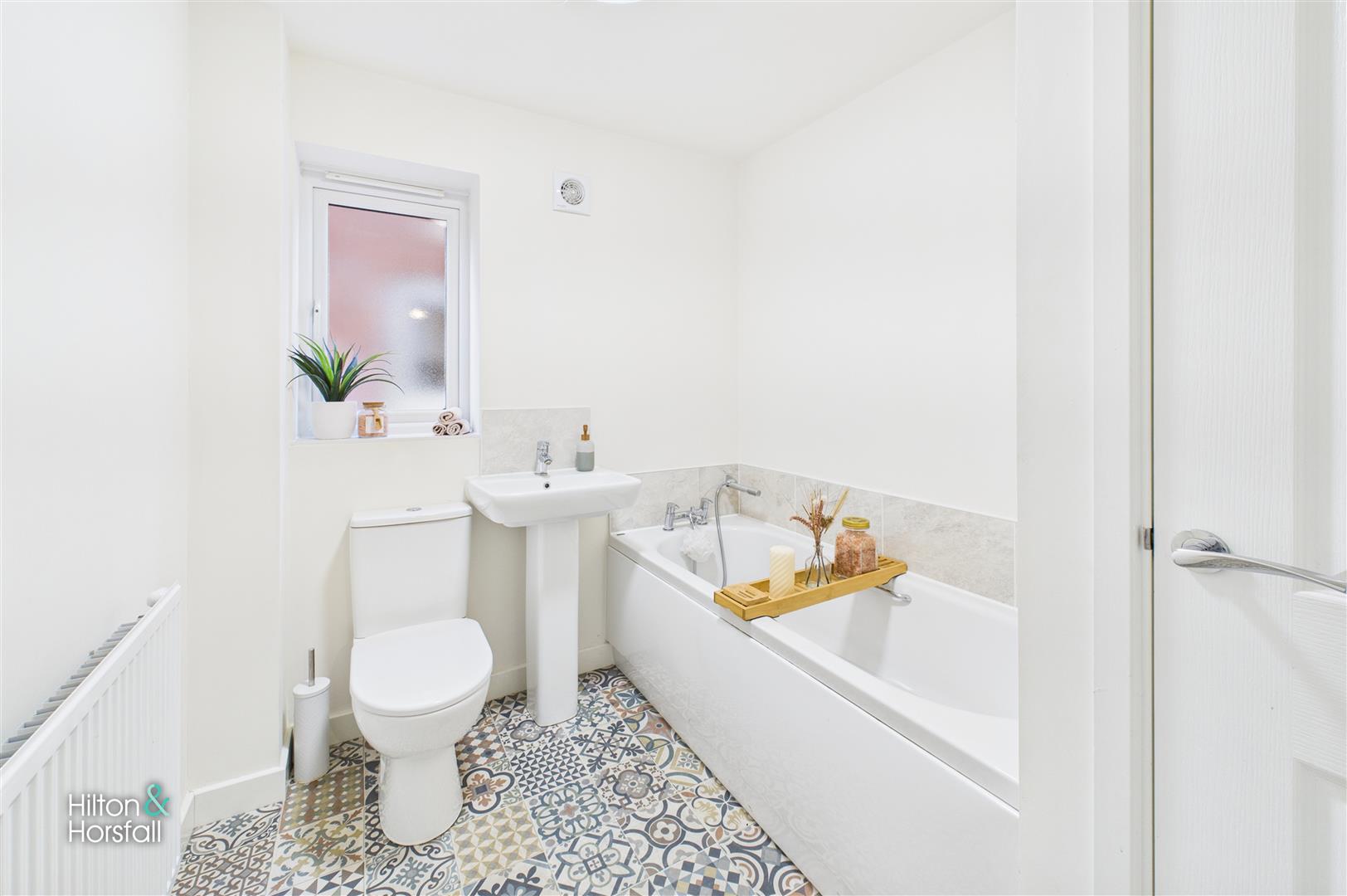 A contemporary family bathroom comprising a three-piece suite including a panelled bath with shower attachment, pedestal wash basin, and low-level WC. Finished with patterned floor tiles, neutral wall tones, and a frosted window providing privacy and natural light, this space offers a clean and modern design ideal for everyday use.