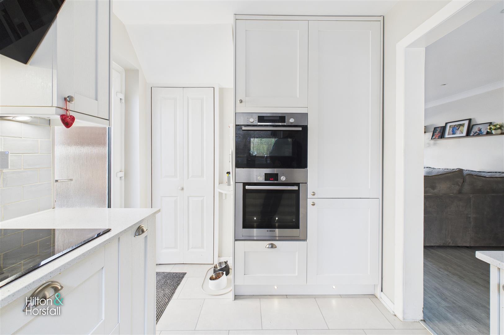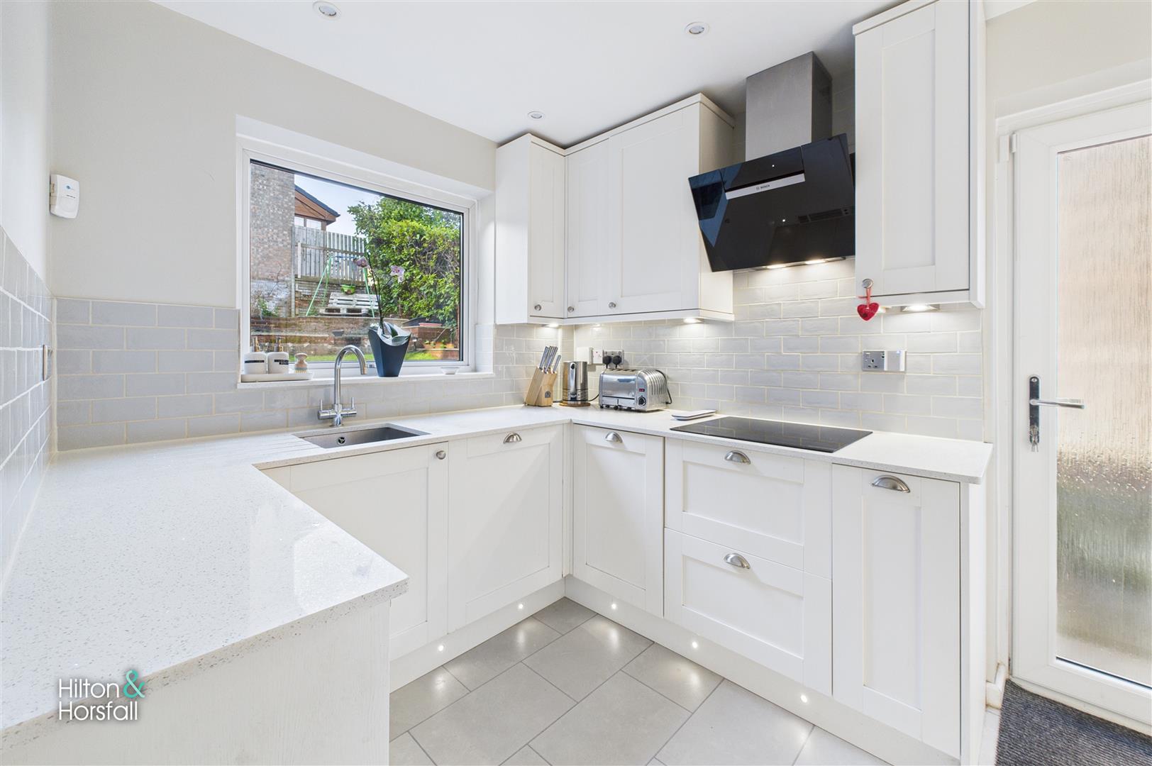 Located to the rear of the property, the kitchen is a bright and stylish space fitted with a modern range of white shaker-style units, complemented by quartz-effect work surfaces, a contemporary subway tile splashback and under-cabinet lighting. Integrated appliances include a double oven and electric hob with sleek extractor, while the stainless-steel sink sits beneath a rear-facing window overlooking the garden. Finished with tiled flooring and recessed ceiling spotlights, the kitchen also benefits from a useful side door providing direct access to the garden, ideal for everyday family life.