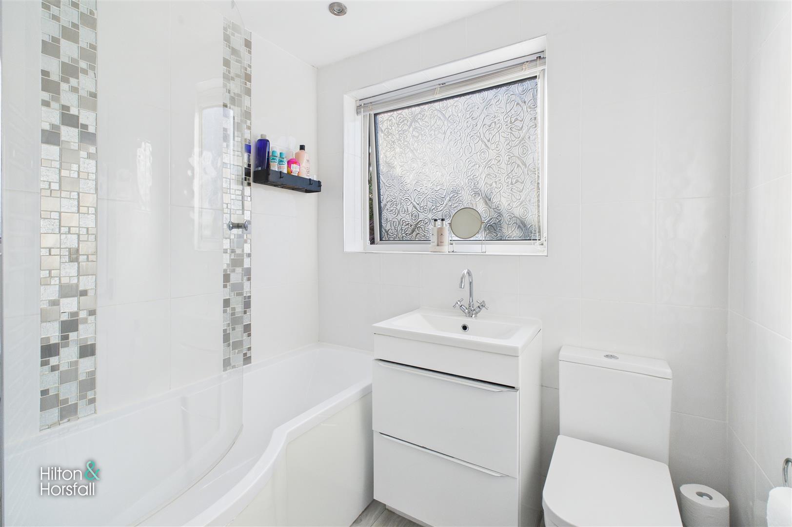 The bathroom is fitted with a modern three-piece suite comprising a panelled bath with shower over, wash basin set within a vanity unit and a low-level WC. Finished with contemporary tiling and a frosted window providing natural light and privacy, the room offers a clean, bright and practical space, ideal for everyday family use.