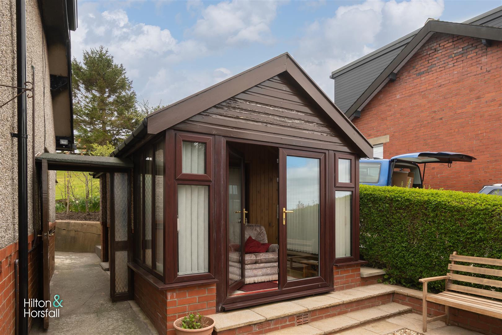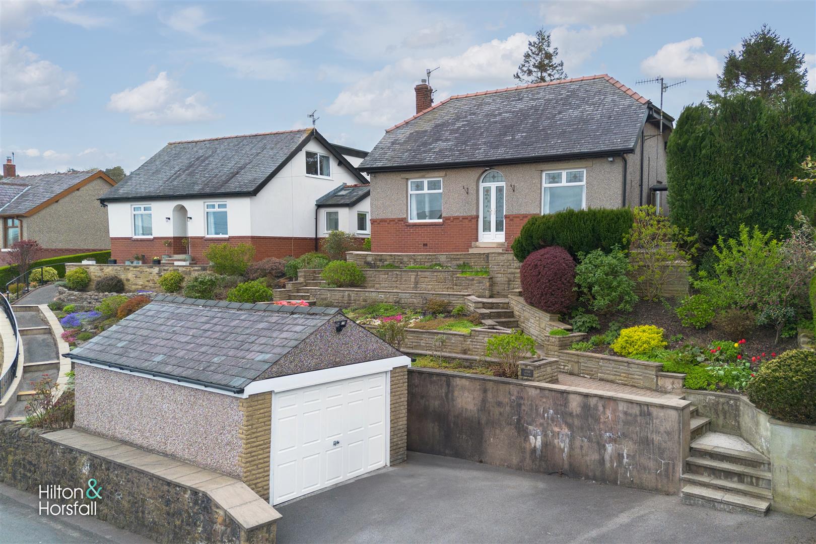Externally to the front is a large tiered garden with a block paved path, mature flower beds, detached single garage and off road parking. To the rear is a large mainly lawned garden with access to the summer house and storage shed.