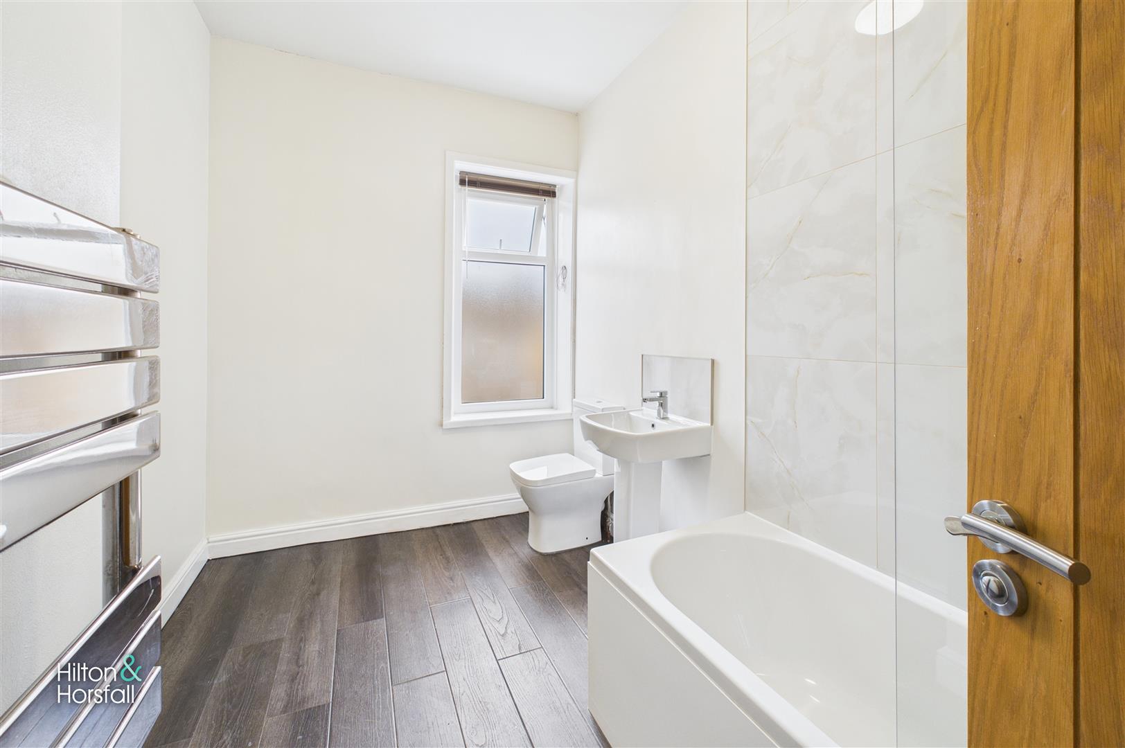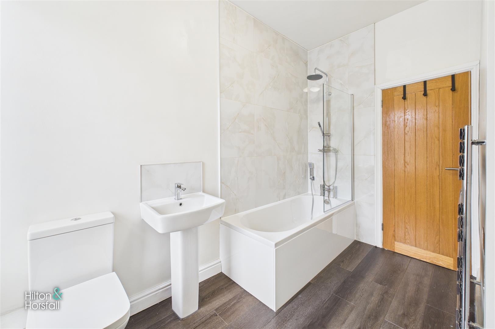 The family bathroom is fitted with a three-piece suite comprising a panelled bath with overhead shower, pedestal wash basin, and low-level WC. Finished with part-tiled walls and neutral décor, the space is both practical and easy to maintain. A frosted window provides natural light and ventilation, completing this functional and well-presented room.