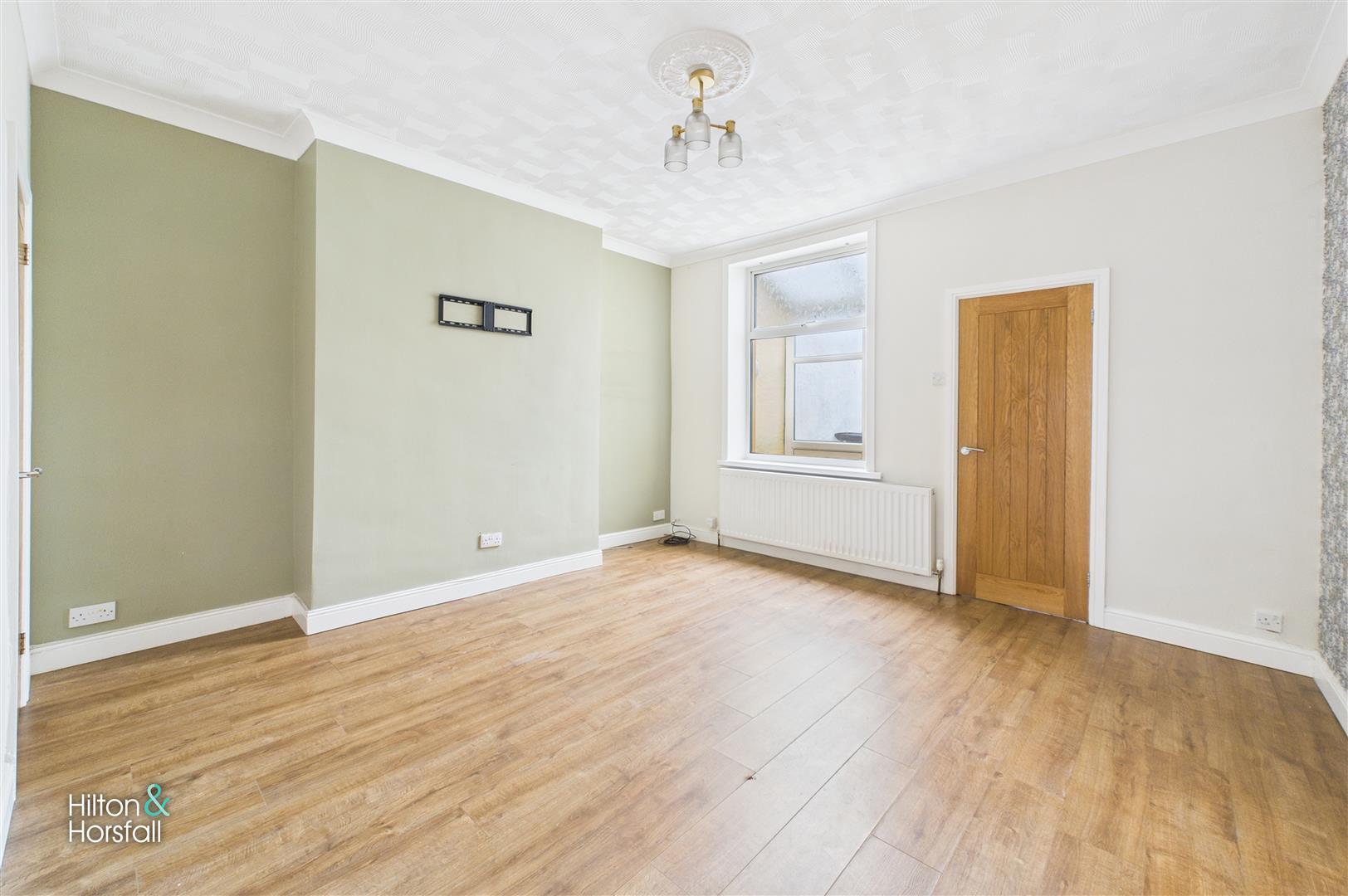 Positioned to the front of the property, this bright and welcoming reception room is the perfect place to relax and unwind. A large double-glazed window allows plenty of natural light to flood the space, highlighting the stylish neutral décor and attractive wood-effect flooring. The room offers ample space for a variety of furniture layouts, making it ideal for cosy evenings in or entertaining guests. Finished with a central ceiling rose, radiator, and modern light fitting, it’s a versatile living area that immediately feels like home.