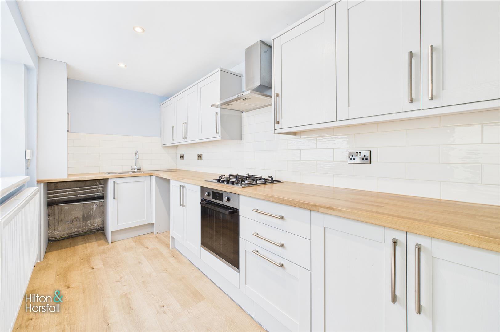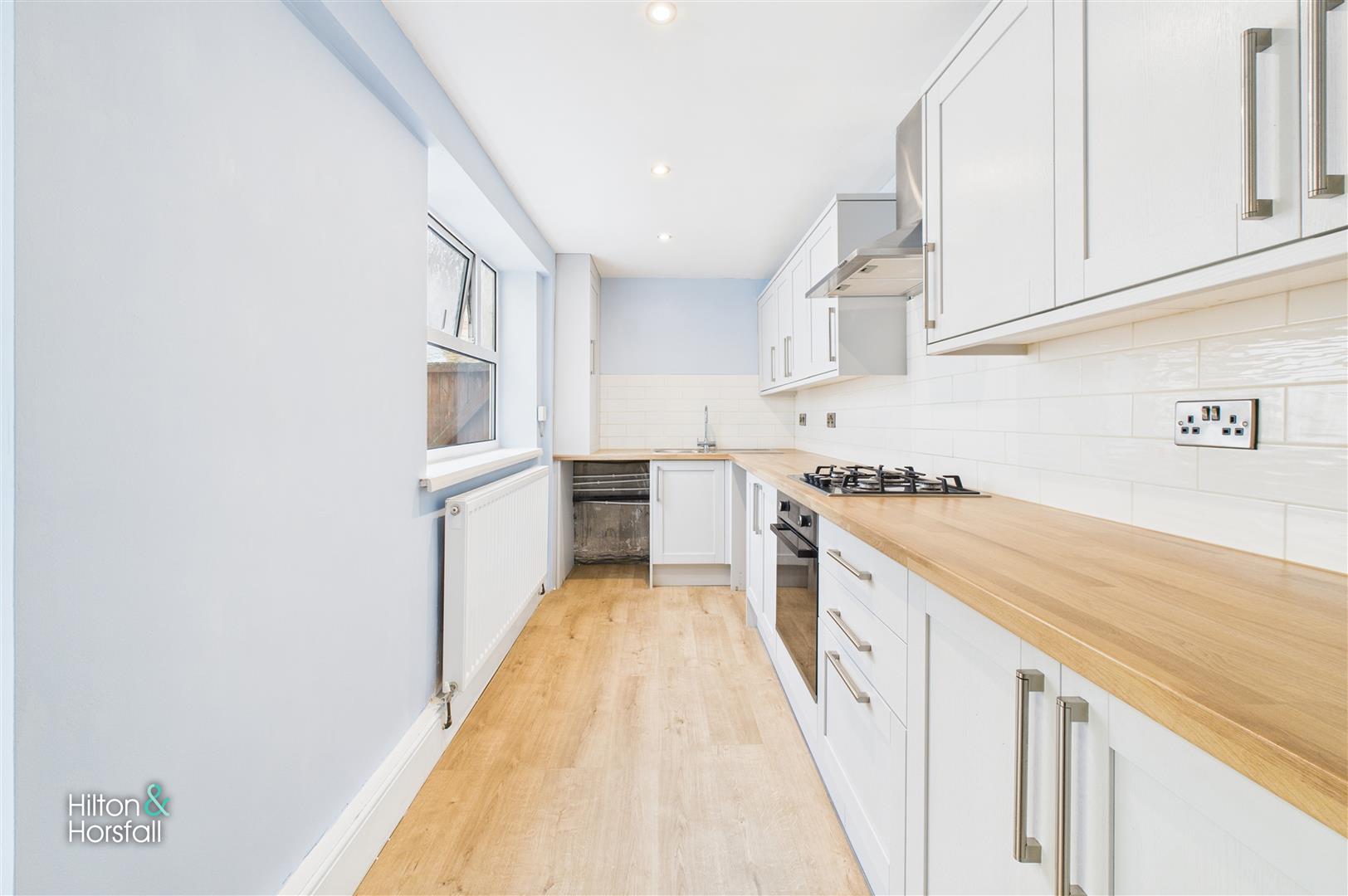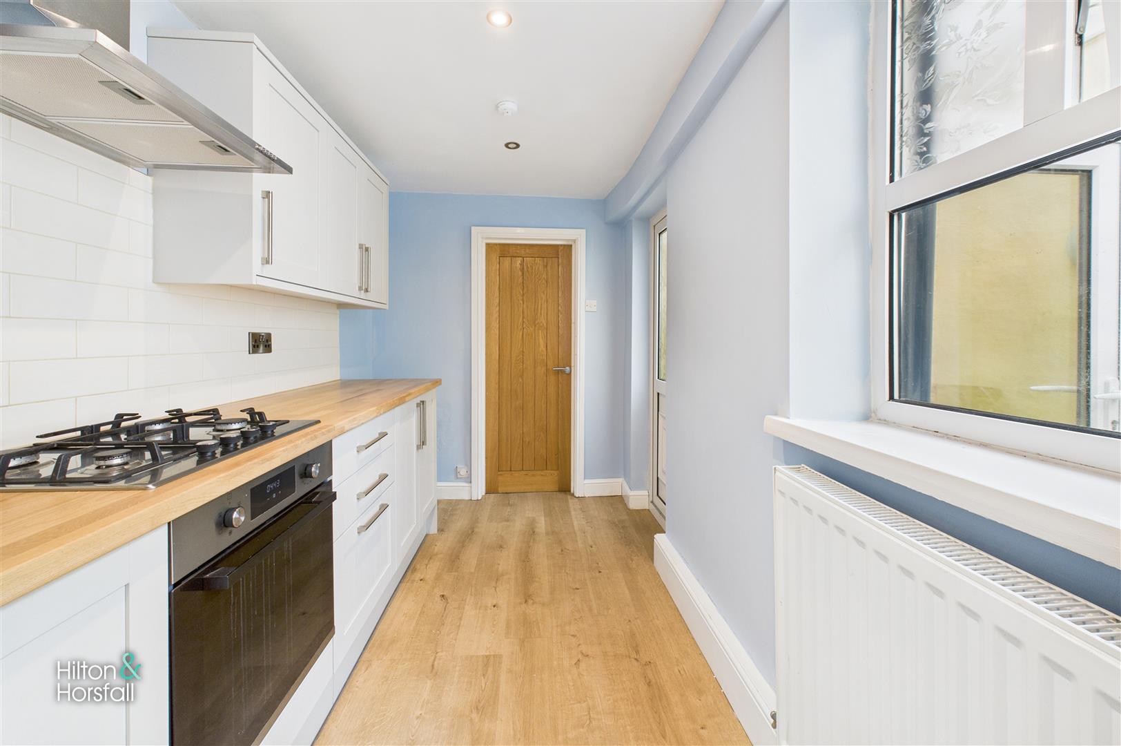 Situated to the rear of the property, the modern galley-style kitchen is fitted with a range of contemporary wall and base units, complemented by sleek work surfaces and tiled splashbacks. It comes complete with an integrated oven, gas hob, and stainless steel extractor hood, along with ample space for appliances. A large window provides plenty of natural light, and a rear door gives access to the outside. Finished in neutral tones with wood-effect flooring, this stylish and functional kitchen is perfect for cooking and everyday living.