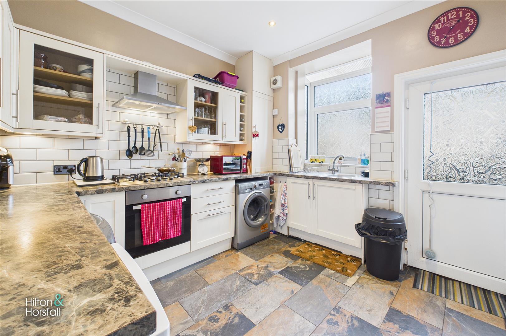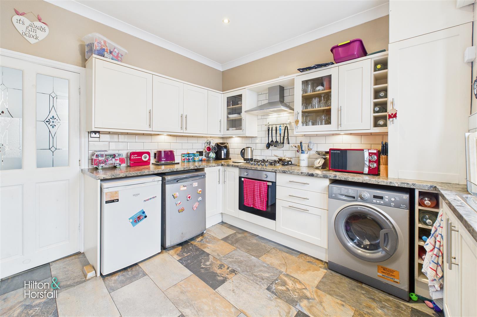 A generous dining kitchen fitted with a range of modern wall and base units, complete with complementary work surfaces and tiled splashbacks. The room offers ample space for dining and is equipped with an integrated oven, gas hob with extractor over, and plumbing for appliances. A large window provides good natural light, while a door leads out to the rear yard. Finished with neutral décor and tiled flooring, this is a practical and well-proportioned space ideal for everyday family use.