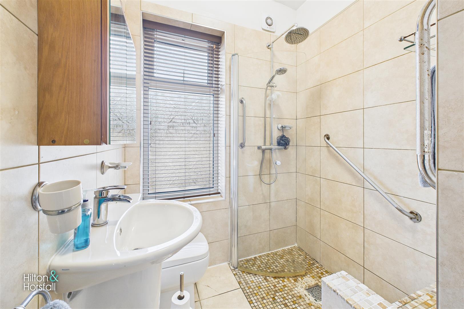 A modern shower room comprising a walk-in shower area with tiled walls, pedestal wash basin and low-level WC. The room features a rear-facing window allowing natural light in while maintaining privacy, along with practical grab rails and tiled flooring. A clean and functional space.