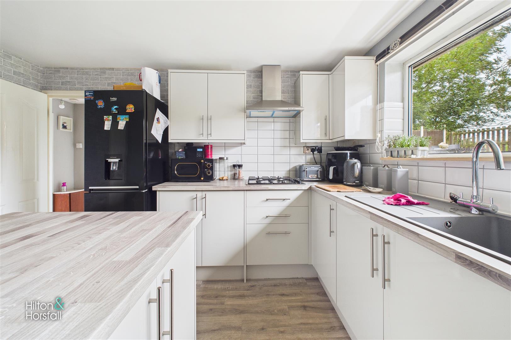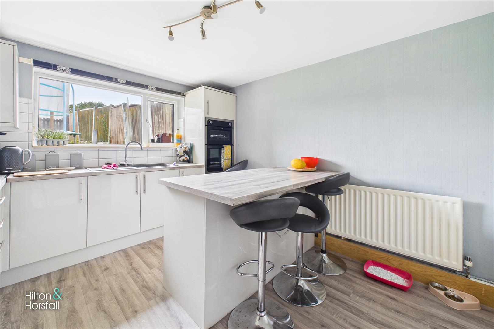 A stylish and contemporary kitchen fitted with a range of modern high-gloss wall, base, and drawer units with contrasting work surfaces. The space includes an integrated oven, four-ring gas hob with stainless steel extractor hood, and a stainless steel sink unit positioned beneath a large window overlooking the rear garden. The layout also features a central breakfast bar with seating, offering a sociable dining area ideal for everyday family life. Finished with wood-effect flooring and neutral décor, this bright and airy room forms the heart of the home.