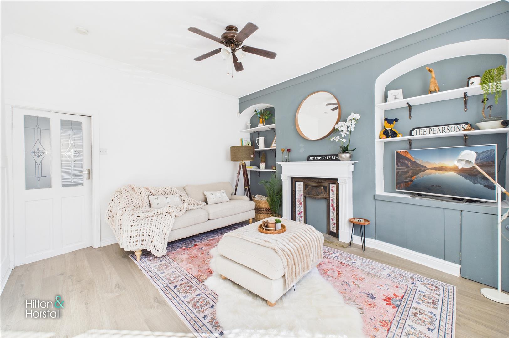 A bright and airy reception space with modern laminate flooring, period-style fireplace with tiled surround, and feature alcove shelving. Front-facing window with fitted blinds and access to the stairs and kitchen.