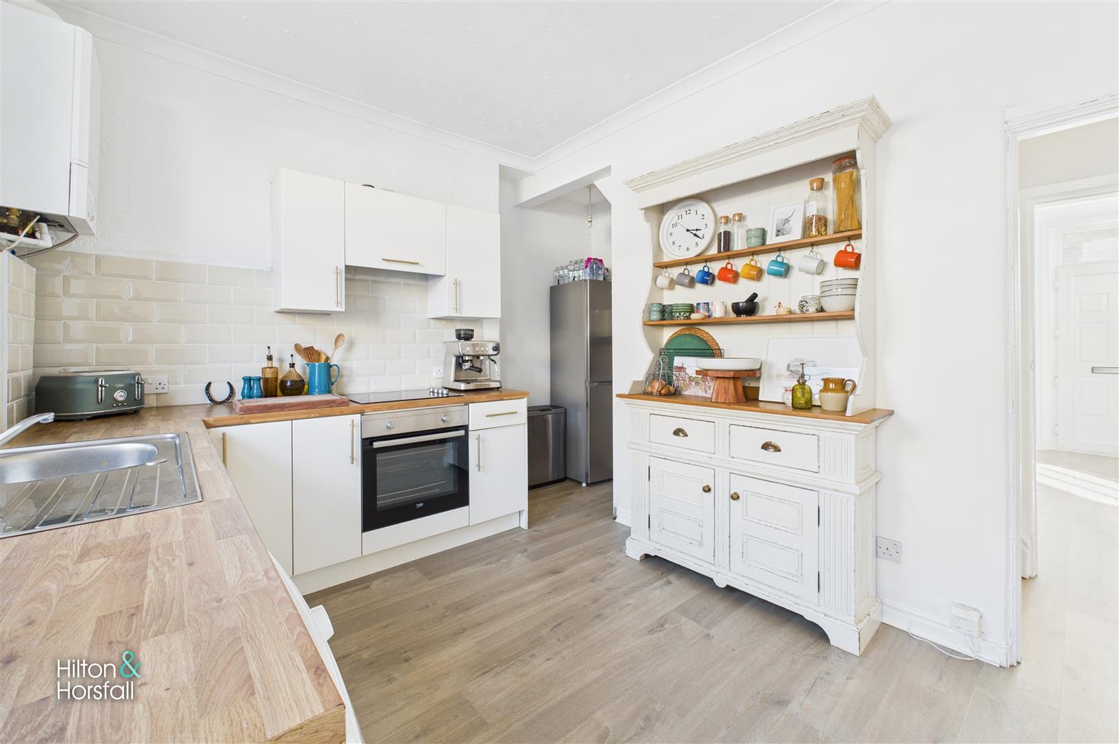 Fitted with a modern range of cream base and wall units with wooden effect worktops, integrated oven with hob, tiled splashbacks and stainless steel sink. Rear door to the yard and rear-facing window allowing plenty of natural light.