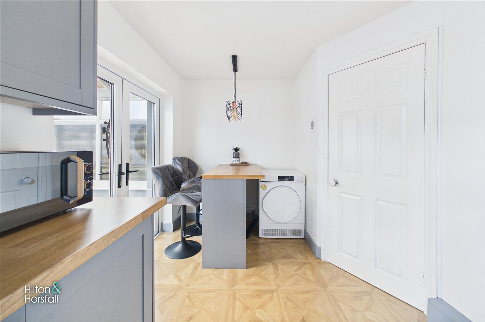 A modern and well-appointed kitchen positioned to the rear of the property, fitted with a range of stylish wall and base units complemented by contrasting work surfaces. The space incorporates integrated appliances and provides ample storage along with generous countertop preparation areas. Recessed ceiling spotlights enhance the contemporary finish, while natural light flows through the rear window and glazed doors which open directly into the conservatory, creating a seamless connection between the two spaces.