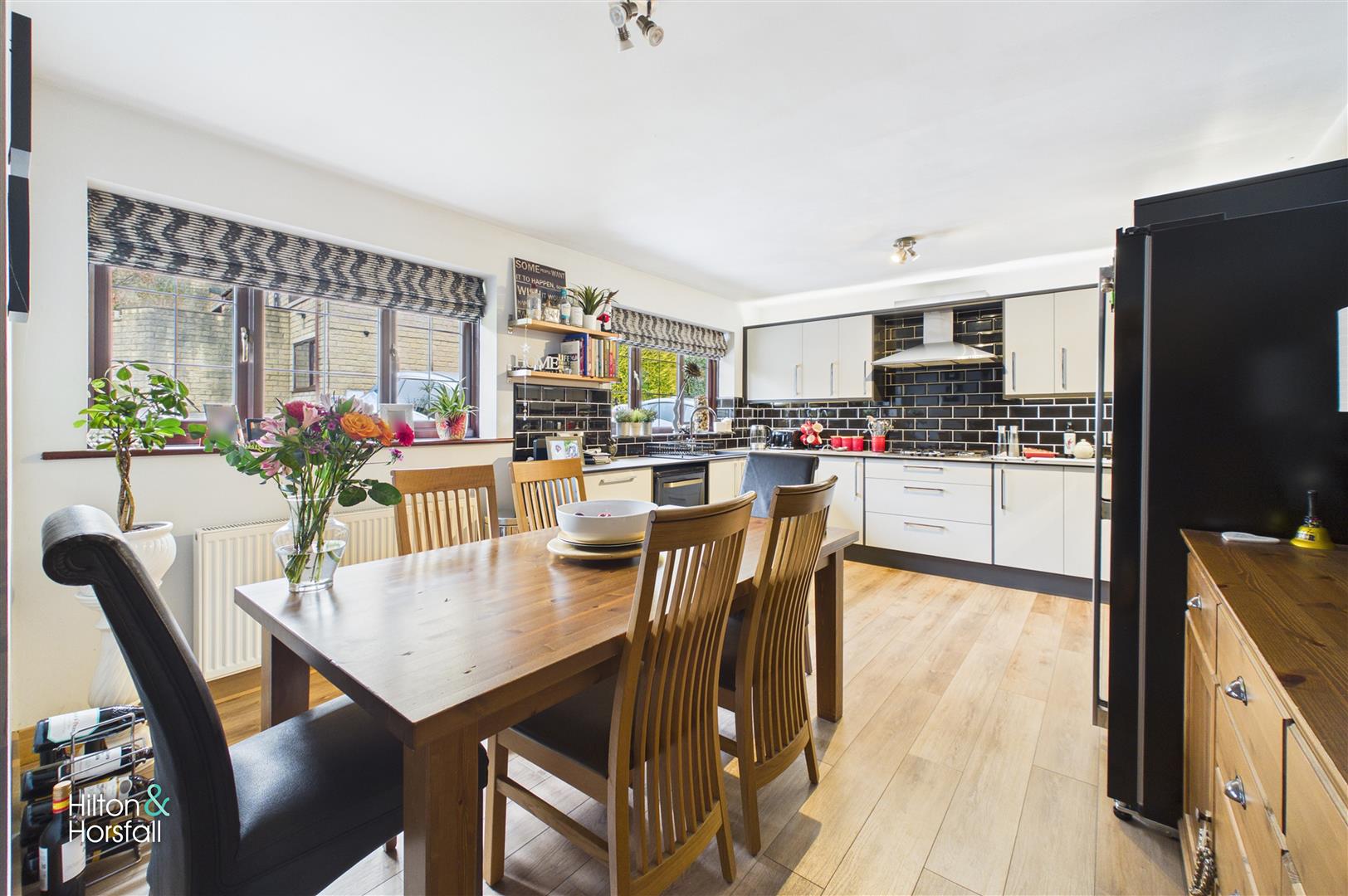 A spacious and modern dining kitchen fitted with a range of contemporary wall and base units with complementary work surfaces and a stylish tiled splashback. The kitchen incorporates a range of integrated appliances along with space for freestanding appliances, while a large window provides plenty of natural light. There is ample room for a family dining table, making it an ideal space for both everyday living and entertaining, all finished with attractive flooring and neutral décor throughout.