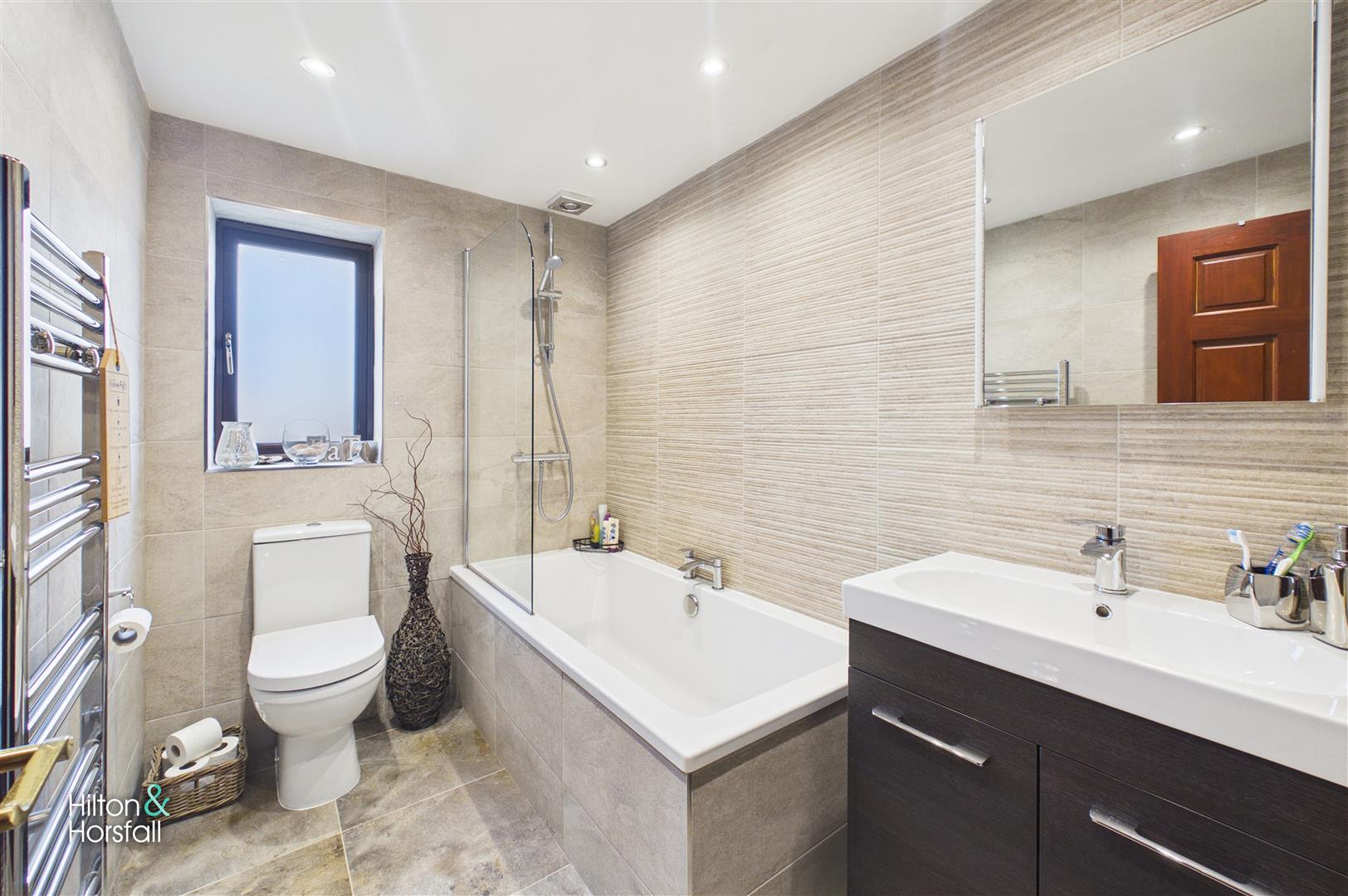 A stylish and modern bathroom fitted with a three-piece suite comprising a panelled bath with shower over and glass screen, a vanity wash hand basin and low level WC. The room is fully tiled with contemporary wall and floor tiles and benefits from recessed ceiling spotlights and a chrome heated towel radiator, creating a sleek and comfortable space.