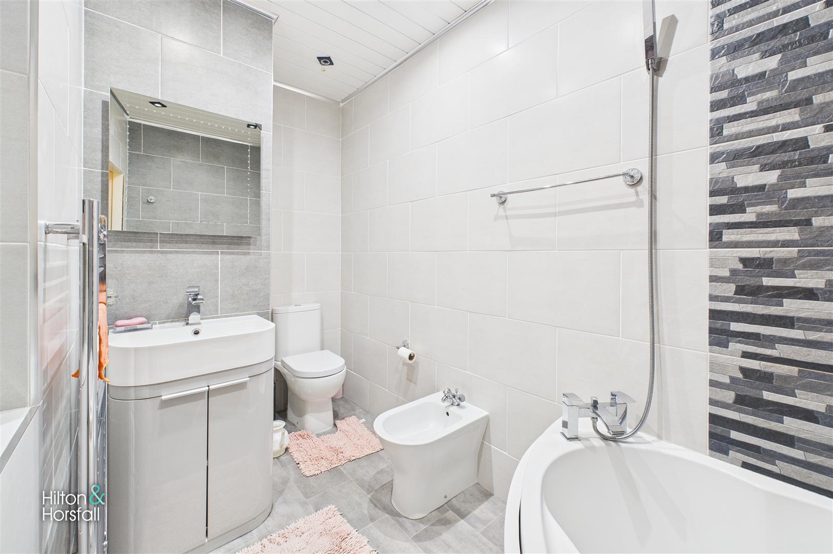 A contemporary family bathroom finished to a high standard and fitted with a modern three-piece suite comprising a panelled bath with overhead shower, a sleek vanity wash basin with storage, and a low-level WC. The room also includes a bidet, chrome heated towel rail, and stylish tiling throughout, creating a clean and modern aesthetic. Recessed ceiling lighting adds a bright and fresh feel to this well-appointed space.