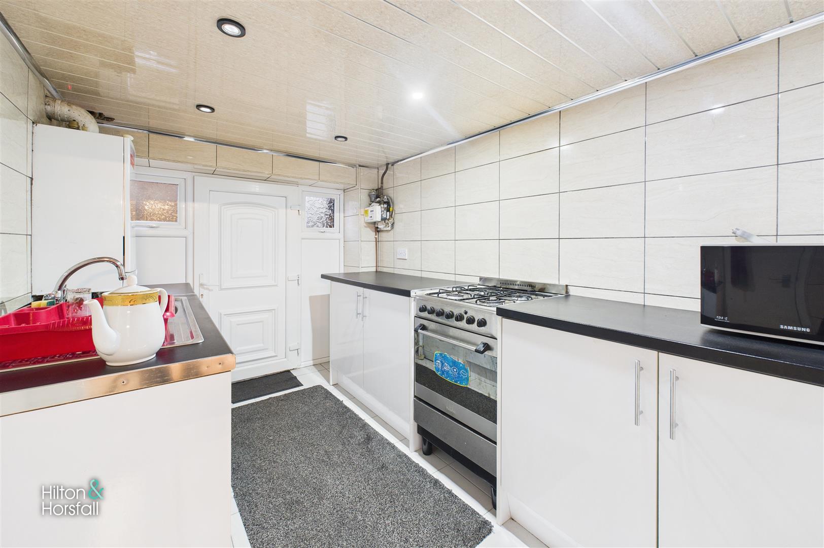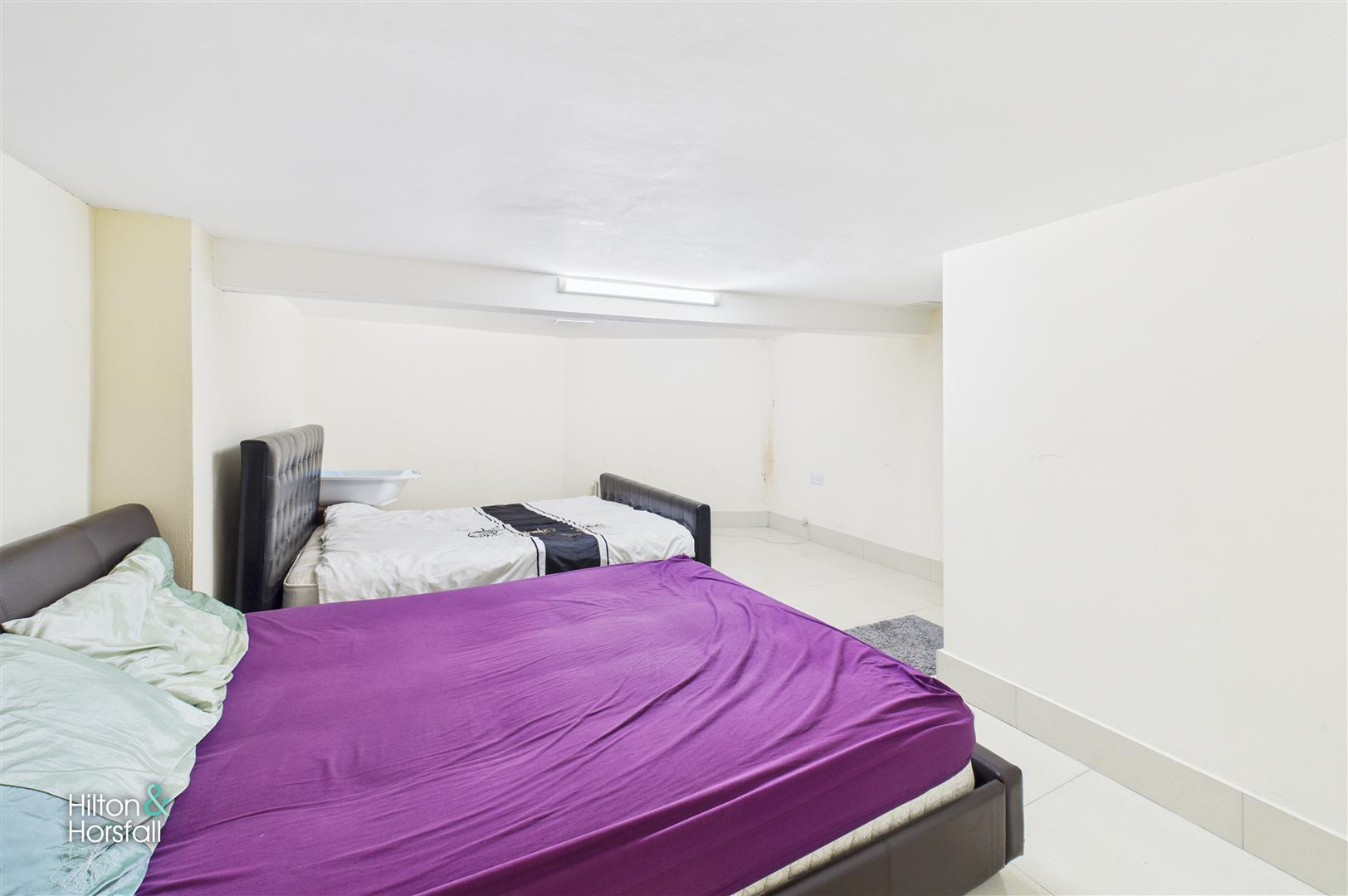 Positioned on the lower-ground level, this additional kitchen provides valuable extra working space and functionality. Fitted with a range of base and wall units, contrasting work surfaces, and a freestanding cooker, the room is fully tiled for ease of maintenance. Recessed ceiling lighting and multiple windows help brighten the space, while a door leads out to the rear of the property. This versatile area is ideal for supplementary storage, food preparation, or general utility use.