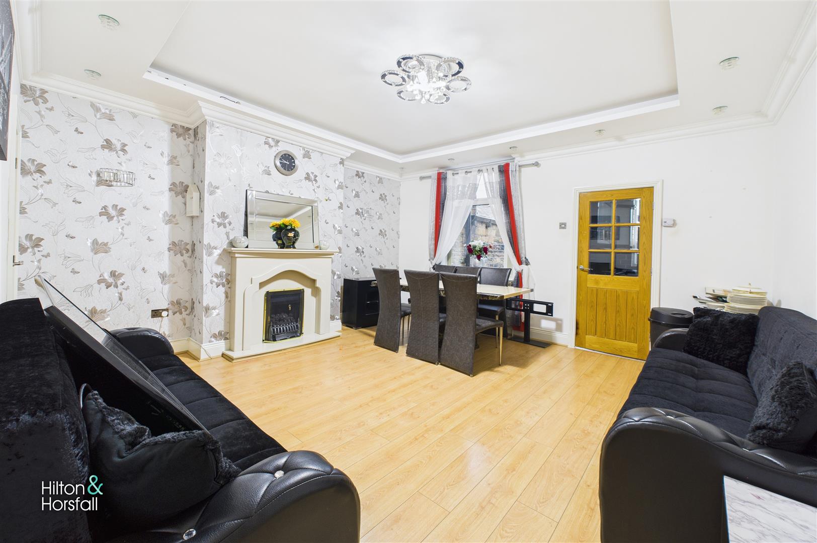A spacious and versatile second reception room, ideal for family living and entertaining. This well-presented space features wood-effect flooring, decorative coving, and a stylish feature fireplace that creates an attractive focal point. A rear-facing window provides pleasant natural light, while the room comfortably accommodates both lounge and dining furniture. A door leads through to the kitchen, making this an excellent everyday living area with great flow throughout the ground floor.
