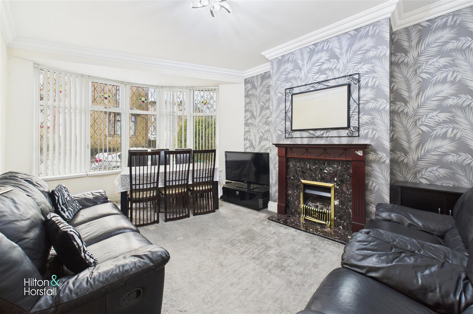 Located at the front of the property, this bright and welcoming reception room features a generous bay window fitted with leaded glazed panels and vertical blinds, allowing plenty of natural light to fill the space. The room is centred around an attractive feature fireplace with a decorative surround and marble-effect hearth, creating a warm focal point. Finished with coving to the ceiling, contemporary décor, and ample space for both lounge and dining furniture, this is a superb room for everyday family living or entertaining.