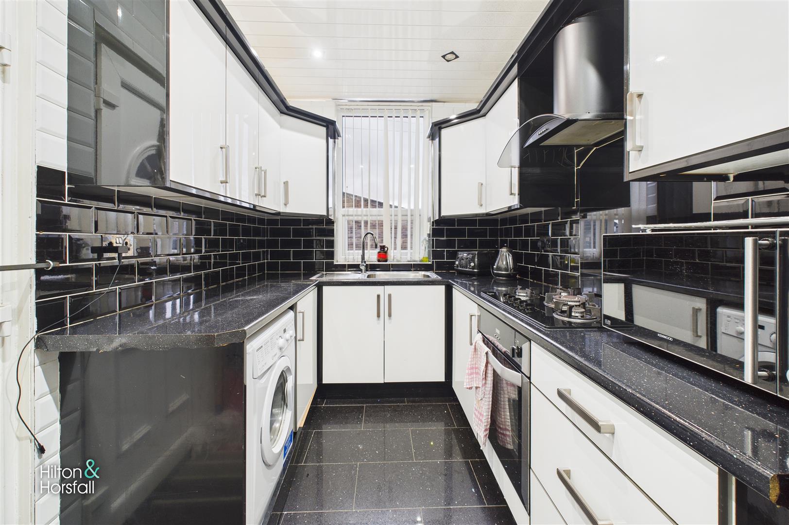 A contemporary fitted kitchen enjoying a sleek, modern design with high-gloss wall and base units, complemented by stylish black tiled splashbacks and matching sparkle-effect work surfaces. The layout provides excellent storage and workspace, along with an integrated oven, gas hob with extractor, and space/plumbing for appliances. A rear-facing window allows natural light into the room, and a door leads through to the rear of the property. This well-presented kitchen offers both practicality and a modern finish ideal for everyday use.