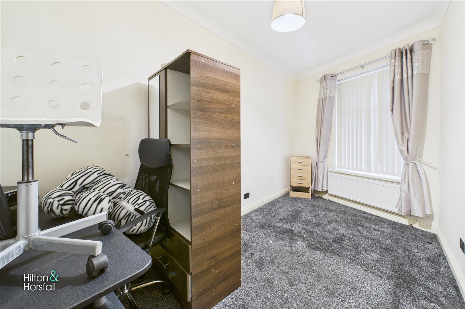 Also positioned at the front of the property, this third bedroom offers a comfortable and versatile space, ideal for use as a single bedroom, nursery, or study. The room benefits from a front-facing window with vertical blinds, neutral décor, and fitted carpet, making it a practical addition to the first-floor layout.