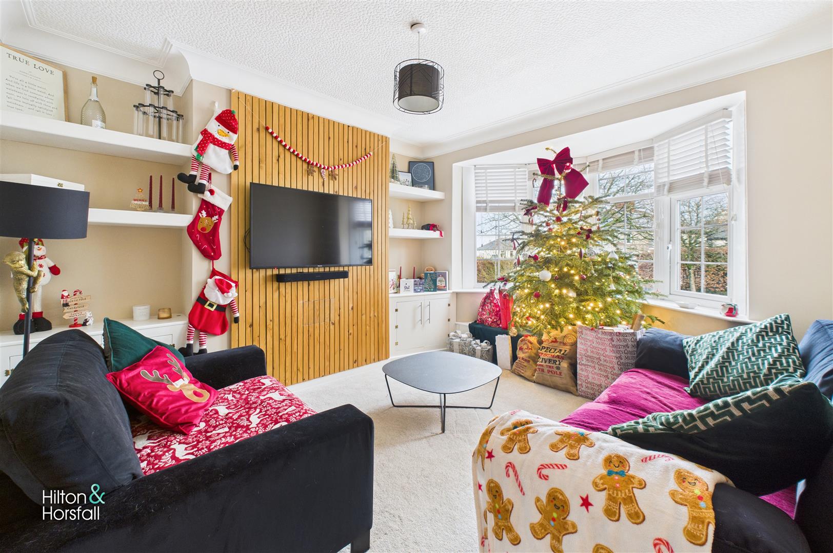 A welcoming and well-proportioned living room positioned to the front of the property, featuring a bay window that allows plenty of natural light to fill the space. The room is tastefully presented with a feature slatted timber media wall, providing an attractive focal point, along with fitted shelving for display and storage. Finished with neutral décor, ceiling coving and a soft carpeted floor, this is a comfortable and inviting space ideal for everyday living and relaxing.