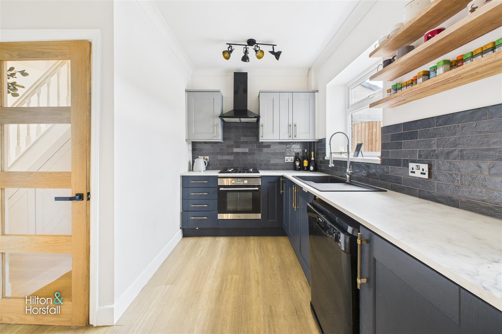 A stylish and contemporary dining kitchen, thoughtfully designed to create a sociable and practical heart to the home. The kitchen area is fitted with a range of modern wall and base units with complementary work surfaces, integrated oven, hob with extractor, and sink unit positioned beneath a window. Open shelving and tiled splashbacks add both character and functionality, while the flooring flows seamlessly throughout the space. The dining area comfortably accommodates a table and seating, enhanced by feature lighting and décor, making it ideal for everyday dining or entertaining. A door provides direct access through to the garden room, allowing for an easy transition between indoor and outdoor living.