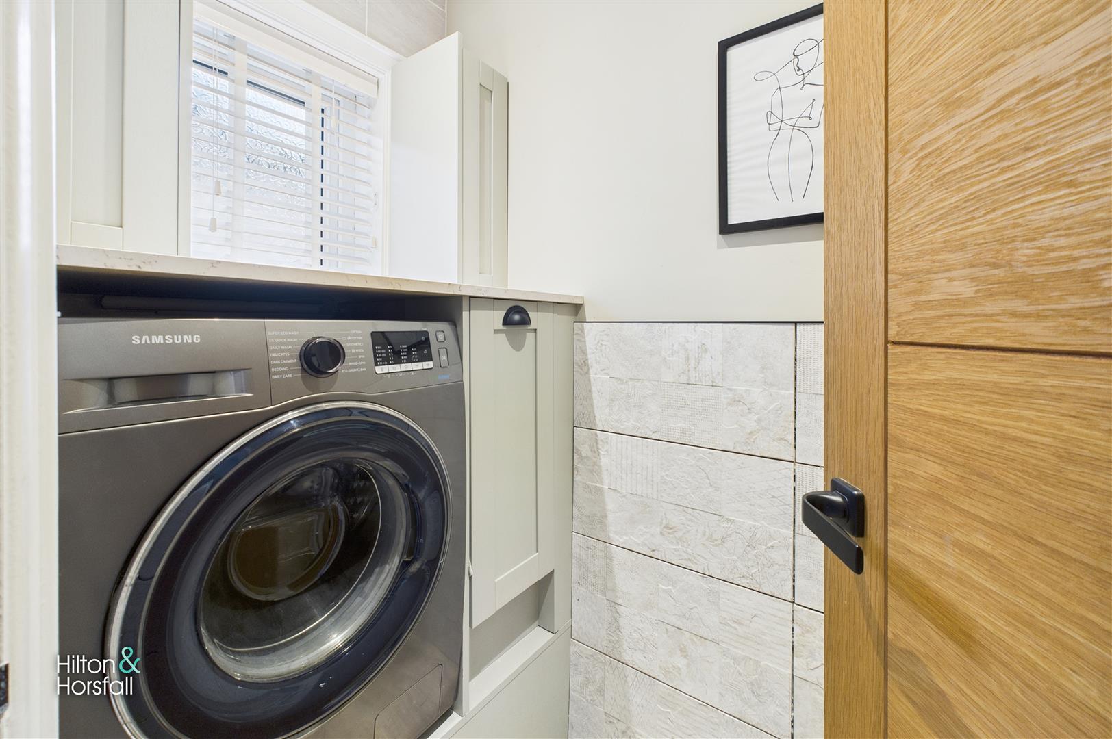 A useful and well-appointed laundry room located on the first floor, fitted with cabinetry and work surface incorporating space and plumbing for appliances. A window to the side elevation provides natural light and ventilation, while the tiled walls and practical layout make this a highly functional addition to the home.