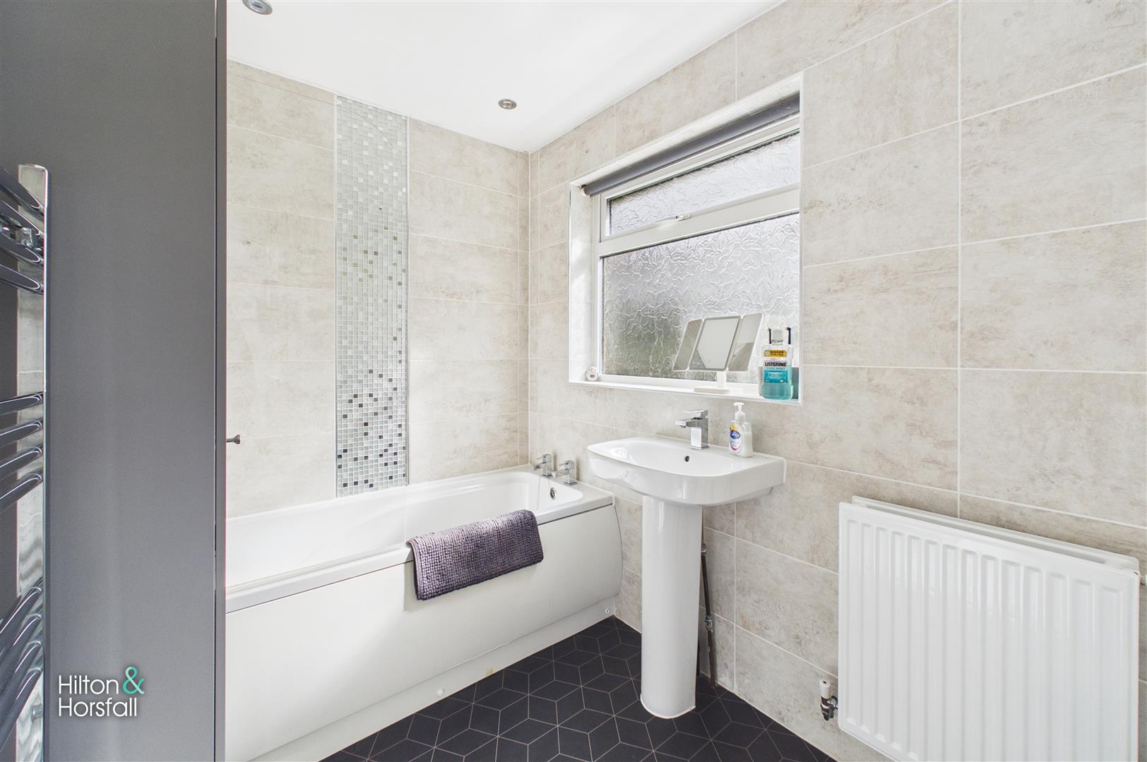 A modern and well-presented three-piece bathroom suite comprising a panelled bath with shower over, pedestal wash basin and low level WC. Fully tiled walls complement the space, along with a frosted window to the rear elevation providing natural light whilst maintaining privacy. Finished with contemporary flooring and a heated towel rail.