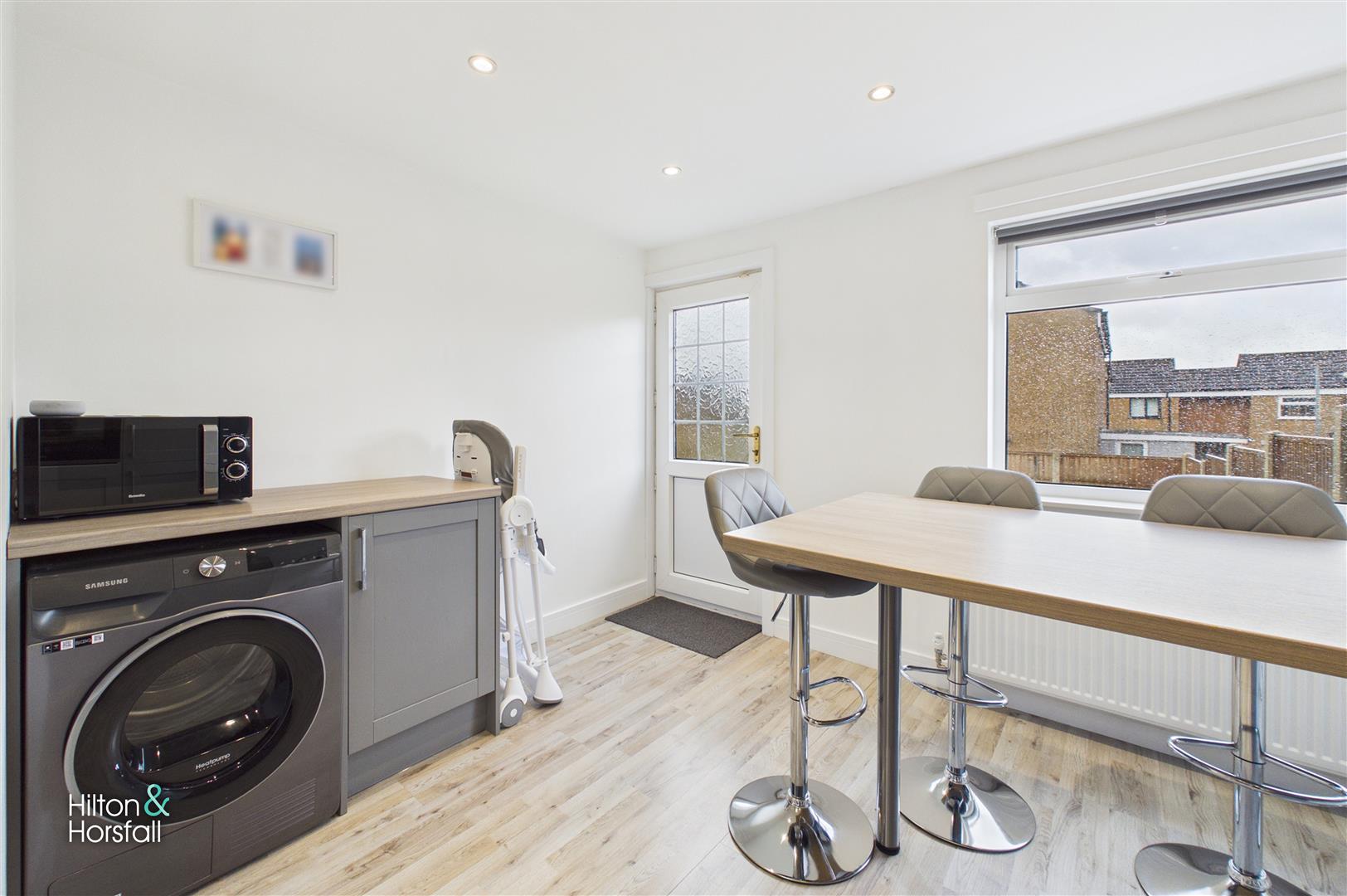 A stylish and well-equipped breakfast kitchen fitted with a range of matching wall and base units with contrasting working surfaces. Having integrated appliances including an oven, hob with extractor over, and space for further appliances. The room offers ample space for dining with a breakfast bar area, making it ideal for everyday family living and entertaining. With a window to the rear elevation overlooking the garden and a door providing access out to the rear, the space is finished with modern flooring and inset spot lighting, creating a bright and contemporary feel throughout.