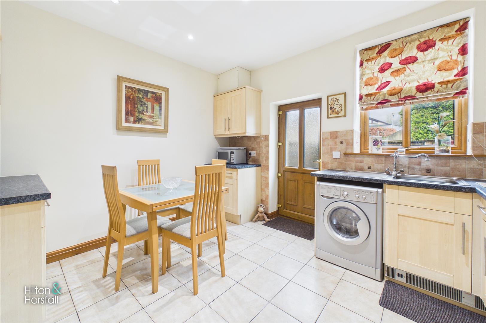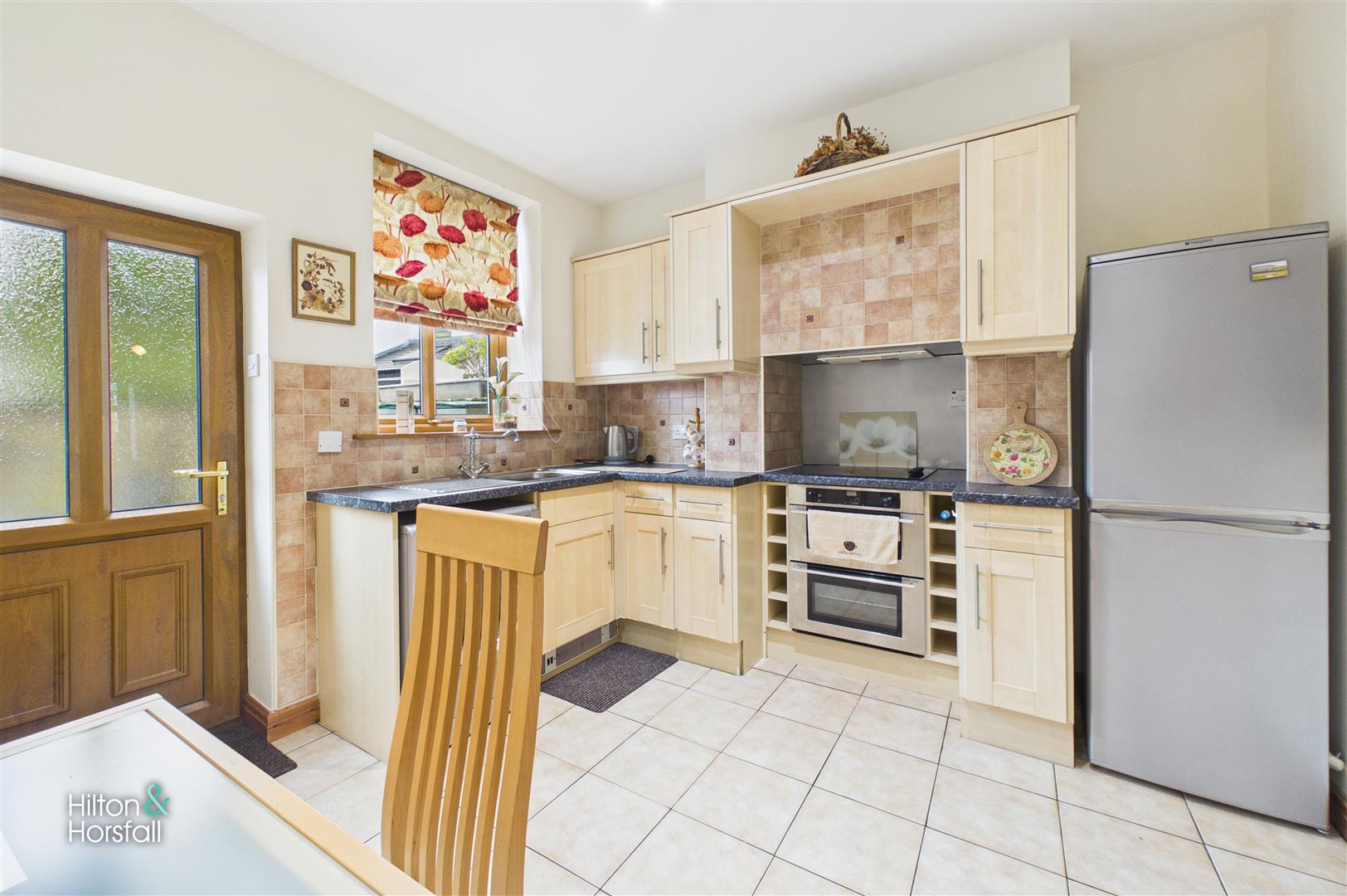 A well-proportioned dining kitchen positioned to the rear of the property, fitted with a range of light wood wall and base units with complementary work surfaces and tiled splashbacks, incorporating a stainless steel sink unit, integrated oven with electric hob and extractor hood, and space for further appliances including washing machine and fridge freezer. There is ample room for a dining table, making it ideal for everyday family meals, whilst a rear-facing window and glazed external door allow in plenty of natural light and provide access out to the rear yard.