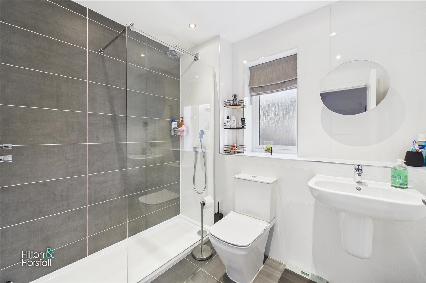 A beautifully upgraded modern bathroom featuring a stylish walk-in shower with a rainfall shower head and separate handheld wand, complemented by a fitted shower basket and high-quality tiled flooring. The space is finished with contemporary wall tiling, a sleek pedestal wash basin, low-flush WC, chrome fixtures and recessed lighting. A frosted window provides privacy while allowing natural light to fill the room, resulting in a clean and refined finish.