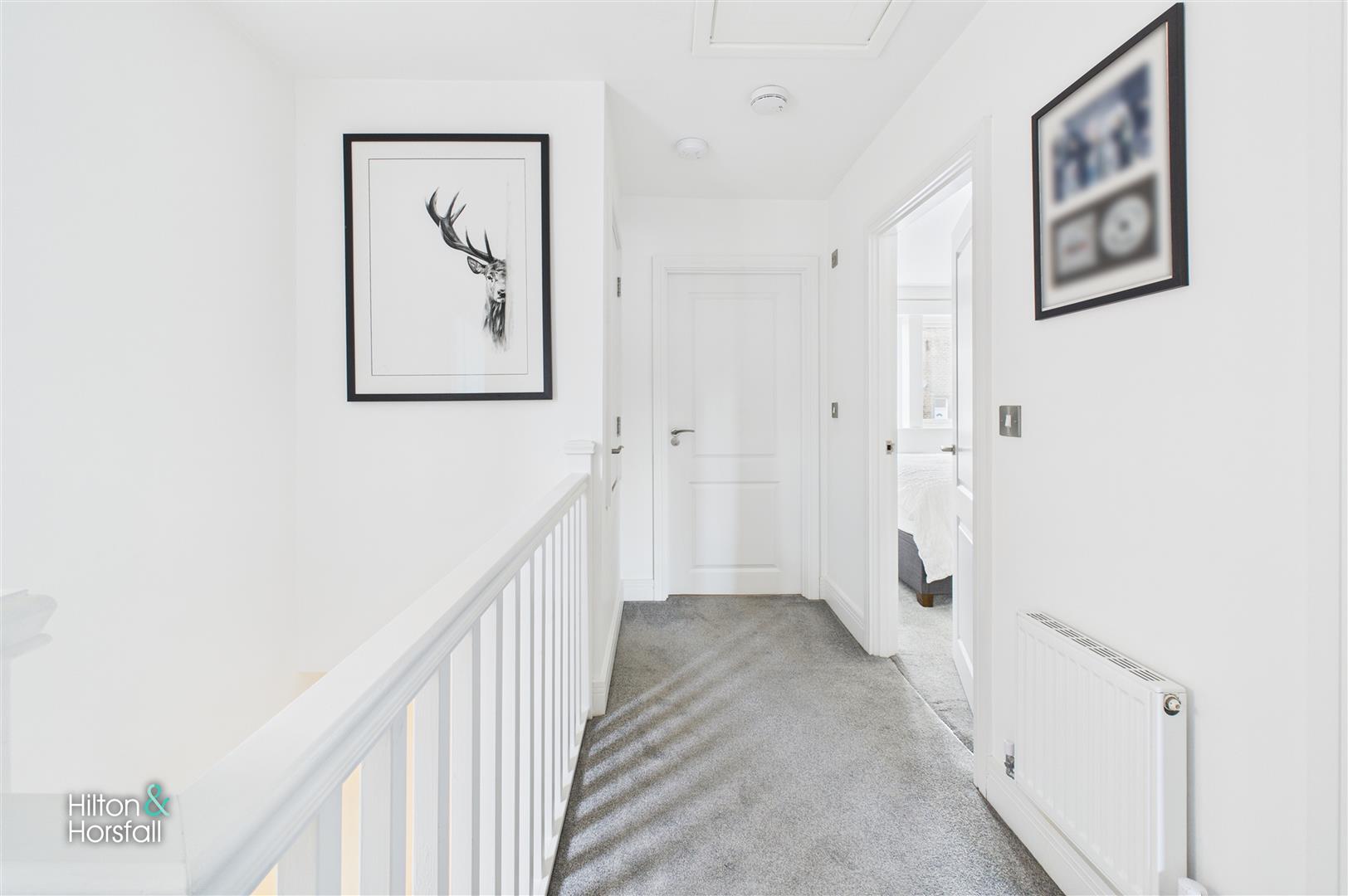 A bright and welcoming landing area providing access to all three bedrooms and the family bathroom. Finished with soft carpeting and neutral décor, the space also includes a useful built-in cupboard positioned over the stairs, offering additional household storage. A hatch provides access to the loft, which has been upgraded with boarding, a fitted ladder and lighting.
