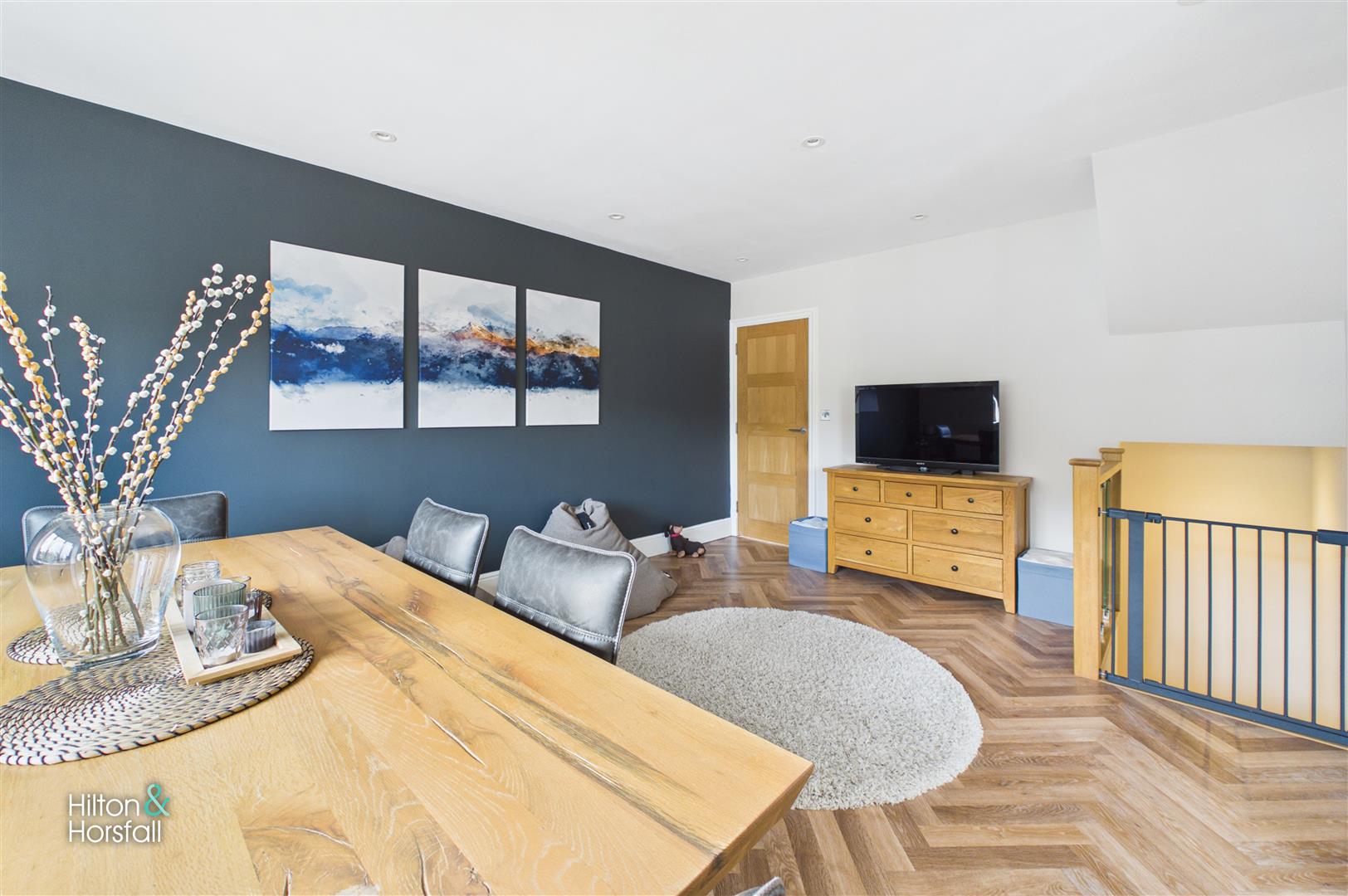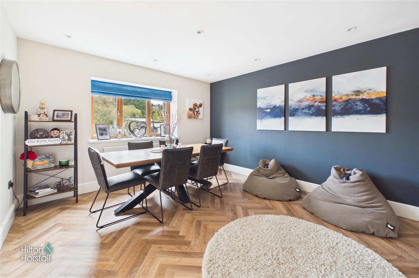 A spacious and beautifully presented dining room providing the perfect setting for family meals and entertaining. The room features stylish décor with a striking feature wall, complemented by modern flooring and recessed ceiling spotlights. A large window allows for plenty of natural light, whilst there is ample space for a full dining table and additional furnishings, creating a bright and inviting atmosphere.