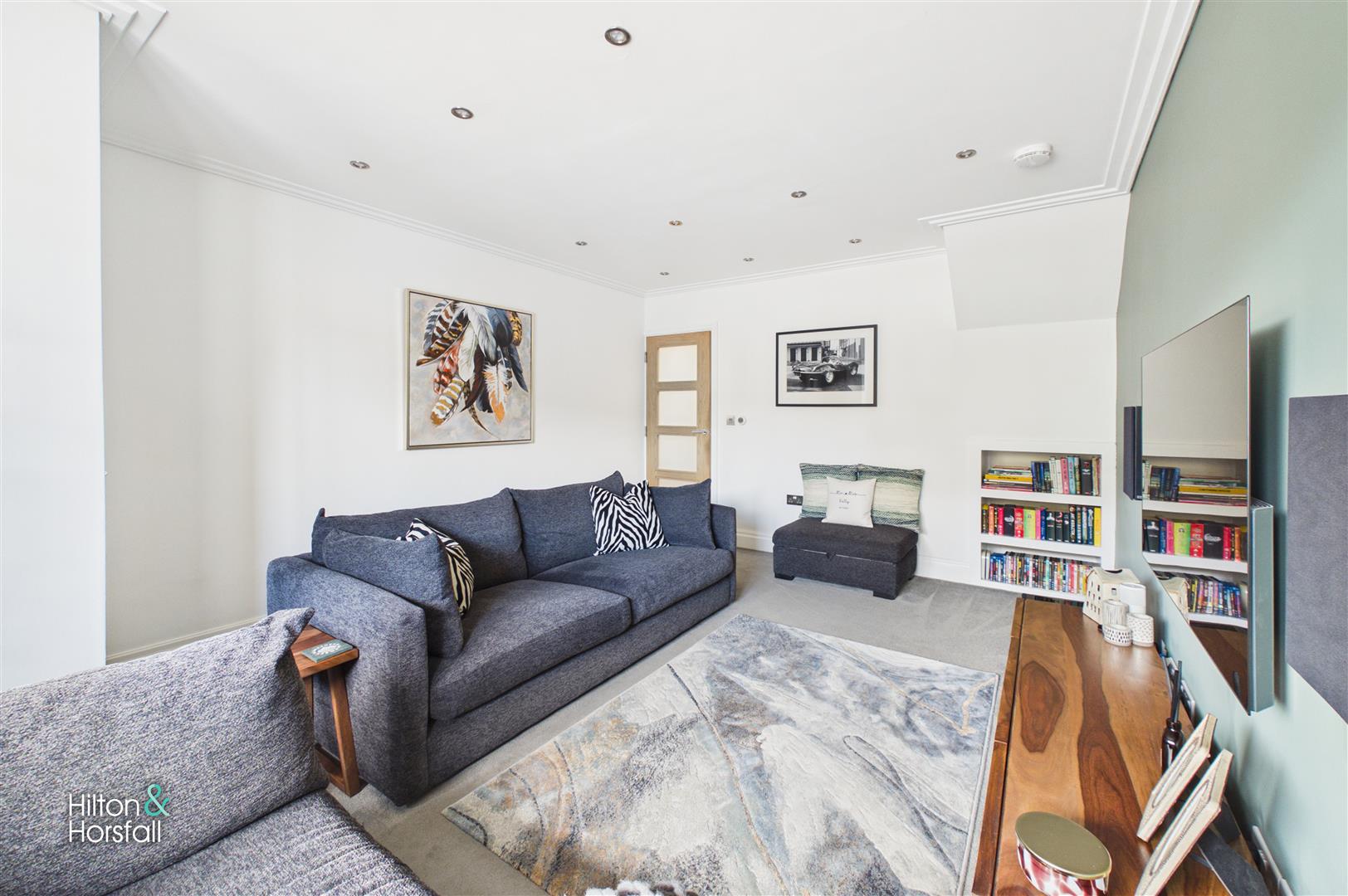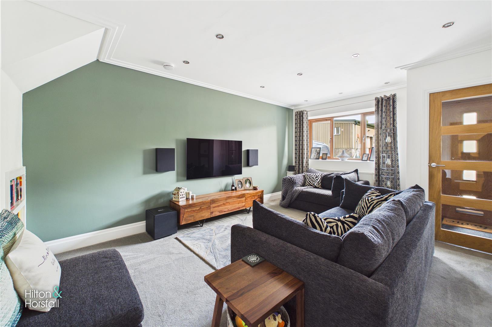 A spacious and beautifully presented living room offering a stylish and comfortable space to relax. The room benefits from a large window allowing plenty of natural light, complemented by modern décor and a feature painted wall creating a contemporary focal point. There is ample space for multiple pieces of furniture, along with recessed ceiling spotlights and built-in shelving, making this a well-designed and inviting family living area.