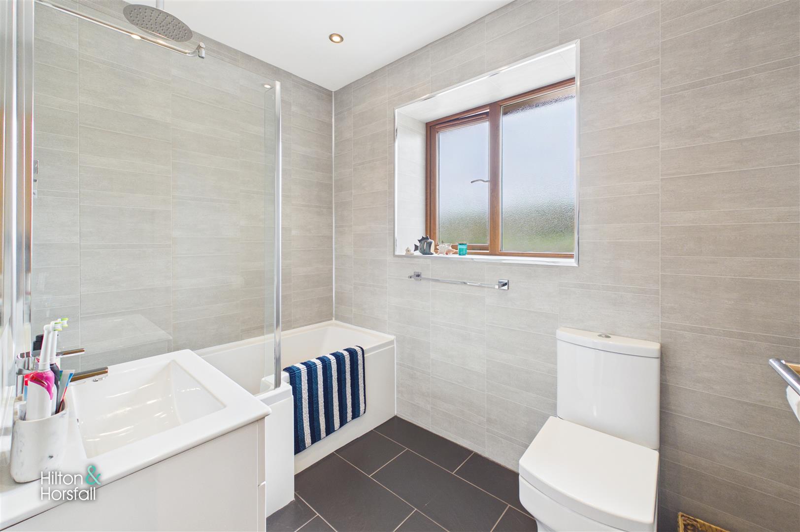 A modern three-piece bathroom suite comprising a panelled bath with shower over, low-level WC and a contemporary vanity sink unit. The room is finished with stylish tiled walls and flooring, along with a window providing natural light, creating a clean and well-presented space.