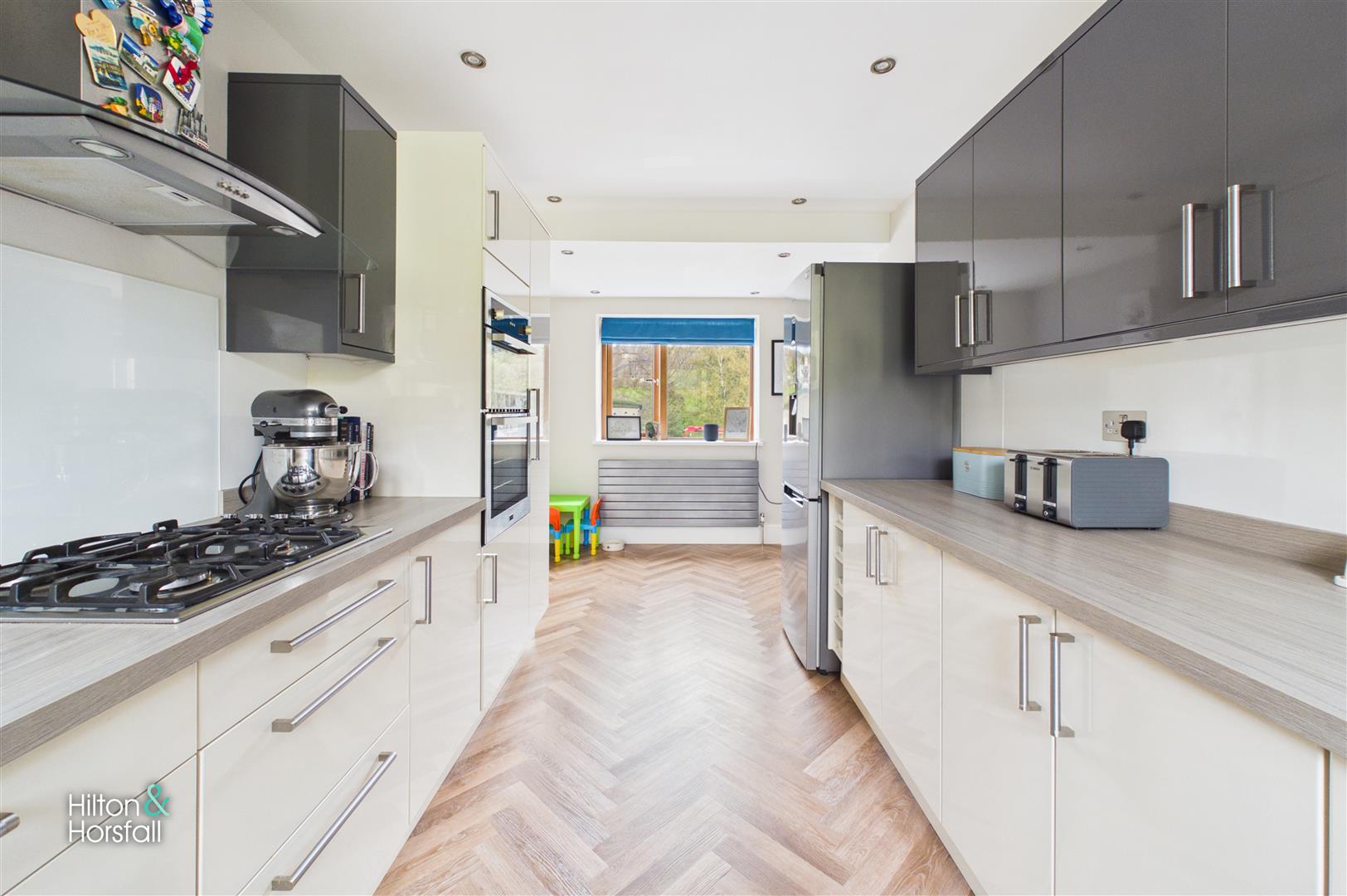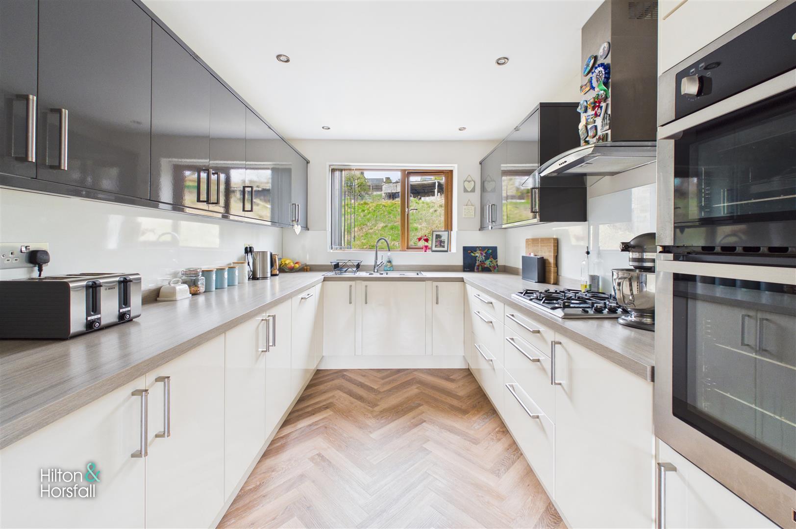 A stunning and spacious kitchen fitted with a modern range of high-gloss wall and base units, complemented by contrasting work surfaces and integrated appliances. The room offers ample storage and preparation space, featuring a gas hob with extractor hood, built-in oven and space for additional appliances. A window allows for plenty of natural light, and the room is finished with stylish flooring and recessed ceiling spotlights, creating a sleek and practical space for everyday use.