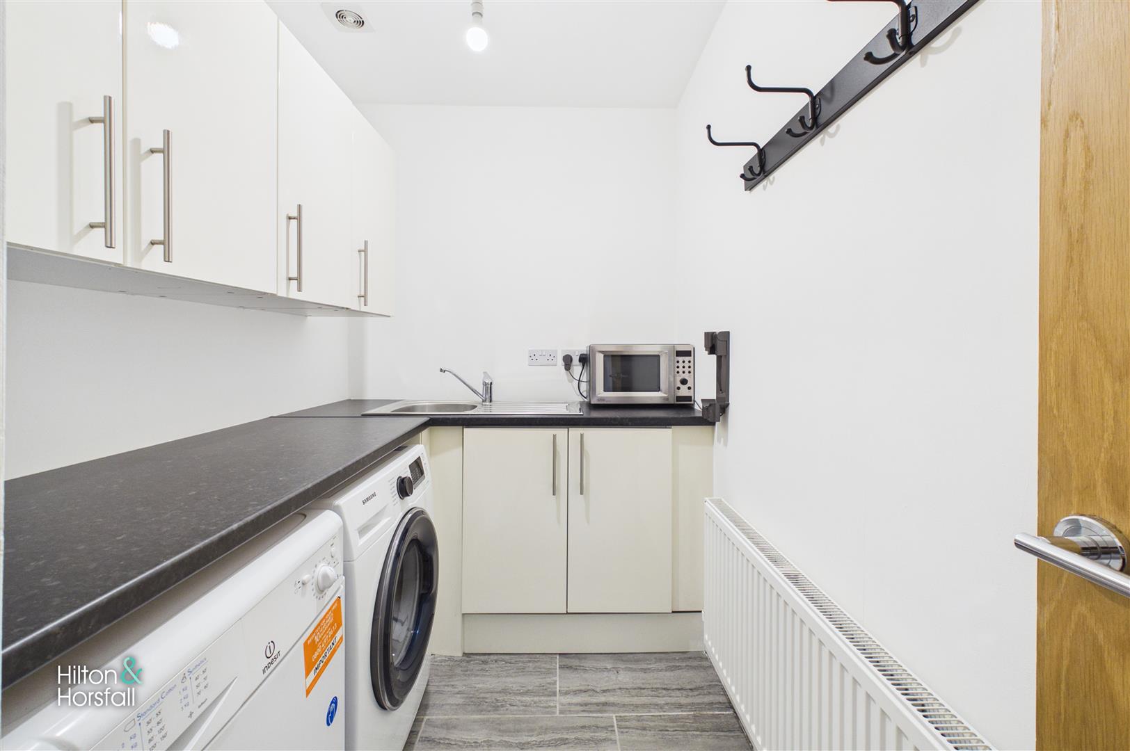 A useful and well-appointed utility room fitted with a range of wall and base units, incorporating a stainless steel sink and drainer along with space and plumbing for appliances. The room provides additional storage and worktop space, helping to keep the main living areas clutter-free, and is finished with modern flooring and neutral décor.
