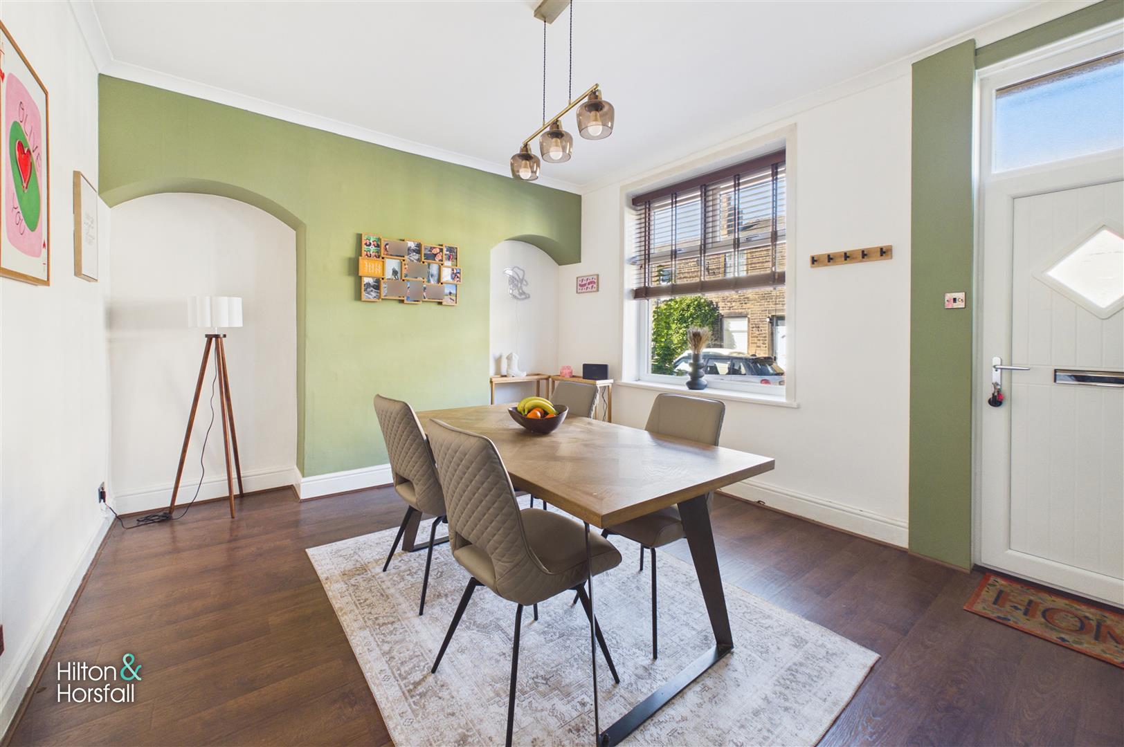 A beautifully presented sitting room positioned to the front of the property, having a large window allowing for plenty of natural light. The room offers ample space for a dining table and chairs, complemented by modern décor and feature alcoves, creating a stylish and versatile living/dining space.