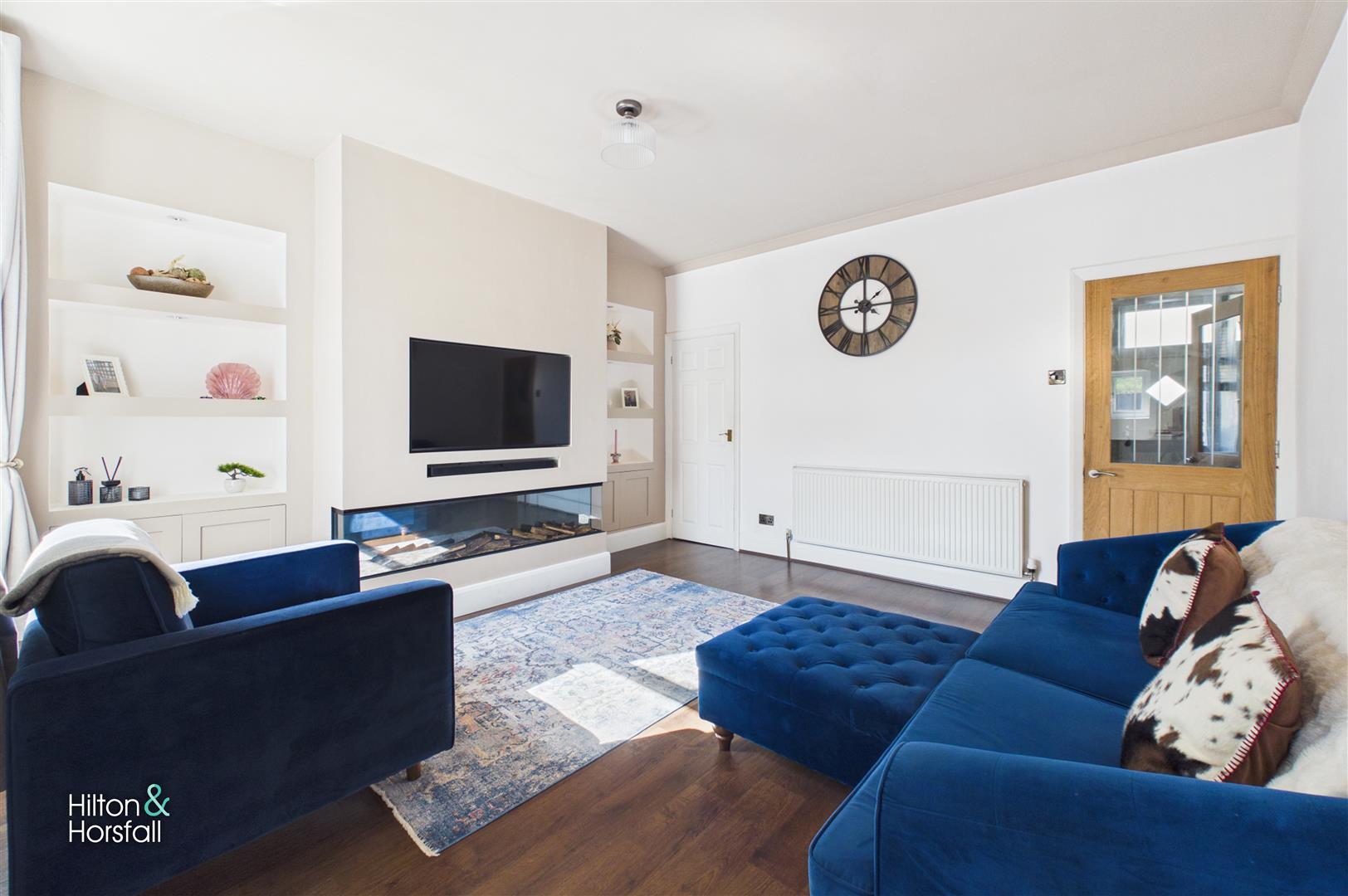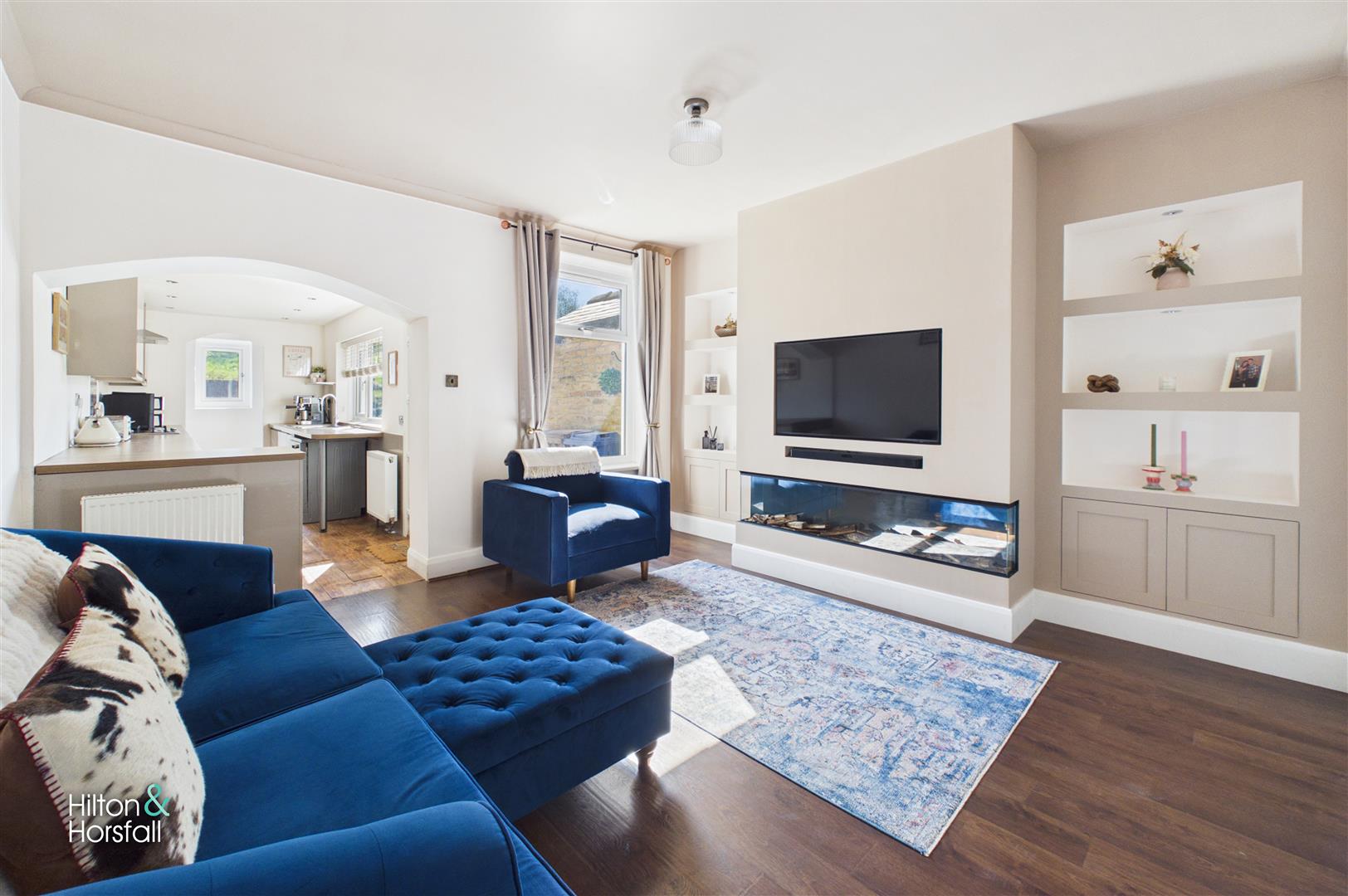 A stunning living room positioned to the rear of the property, beautifully presented and filled with natural light via a large window. The room features a contemporary media wall incorporating a sleek inset fireplace and bespoke fitted shelving, creating a real focal point. The living room also provides access down to the cellar, offering useful additional storage with light, whilst open access through to the kitchen enhances the flow of the home, making this an ideal space for both relaxing and entertaining.