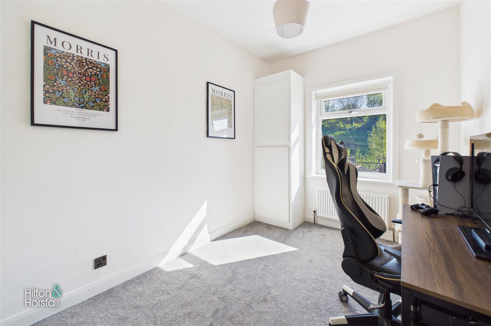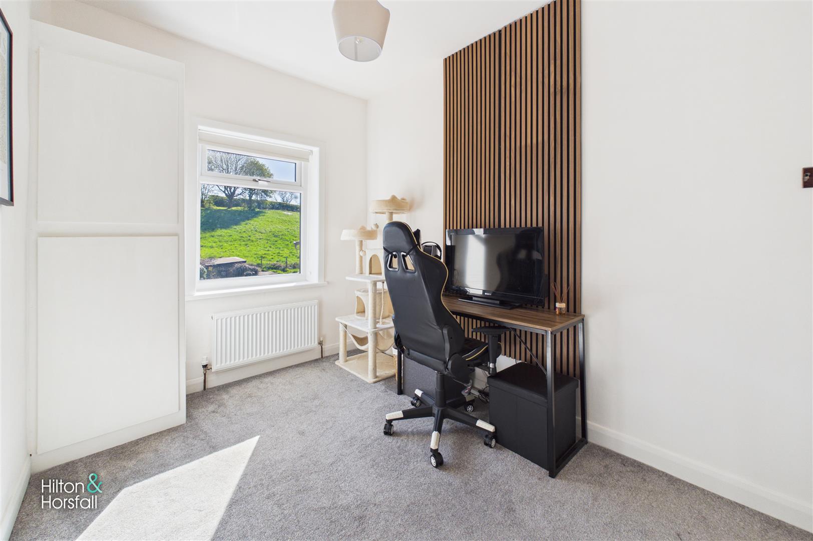 A well-proportioned second bedroom positioned to the rear of the property, having a window allowing for plenty of natural light. The room offers space for freestanding furniture and is currently utilised as a home office, making it a versatile space to suit a variety of needs.