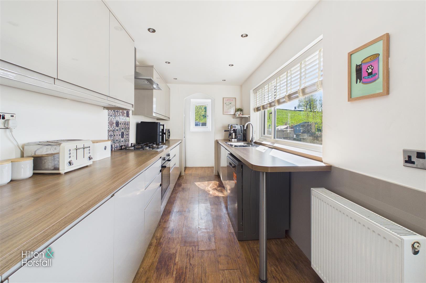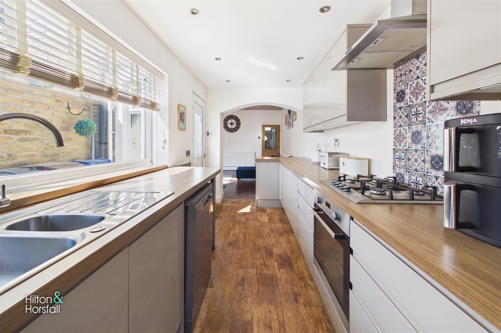 A modern fitted kitchen comprising a range of matching wall and base units with contrasting work surfaces and tiled splashbacks. Having an inset sink with drainer, integrated oven with gas hob and extractor over, and space for further appliances. The room is well lit via a window to the side, with open access leading through to the living room and a door providing access out to the rear.