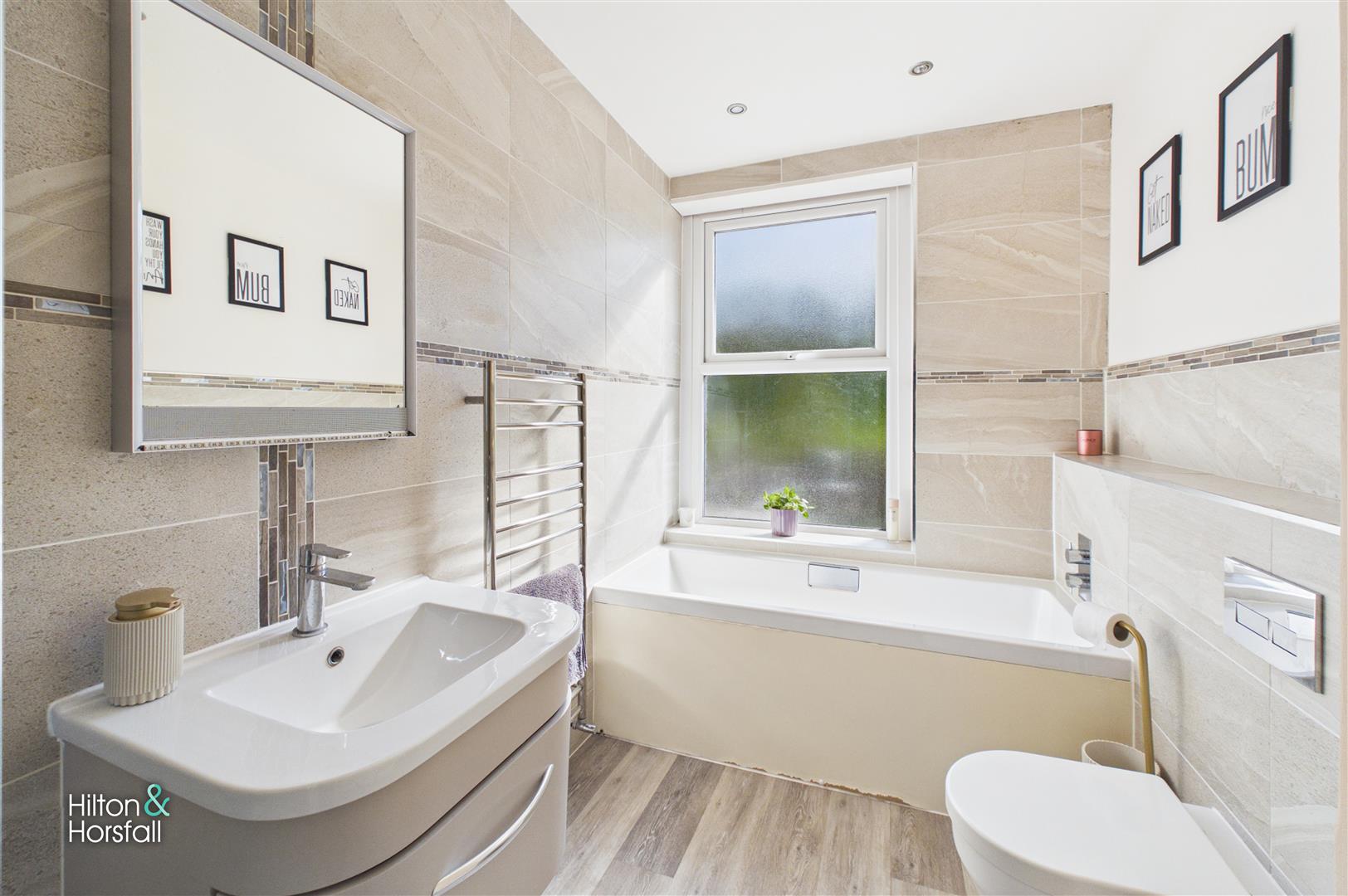 A modern three-piece bathroom suite comprising a panelled bath, walk-in shower enclosure, low level WC and a vanity wash basin. Fully tiled walls complement the space, along with a heated towel rail and a window allowing for natural light.