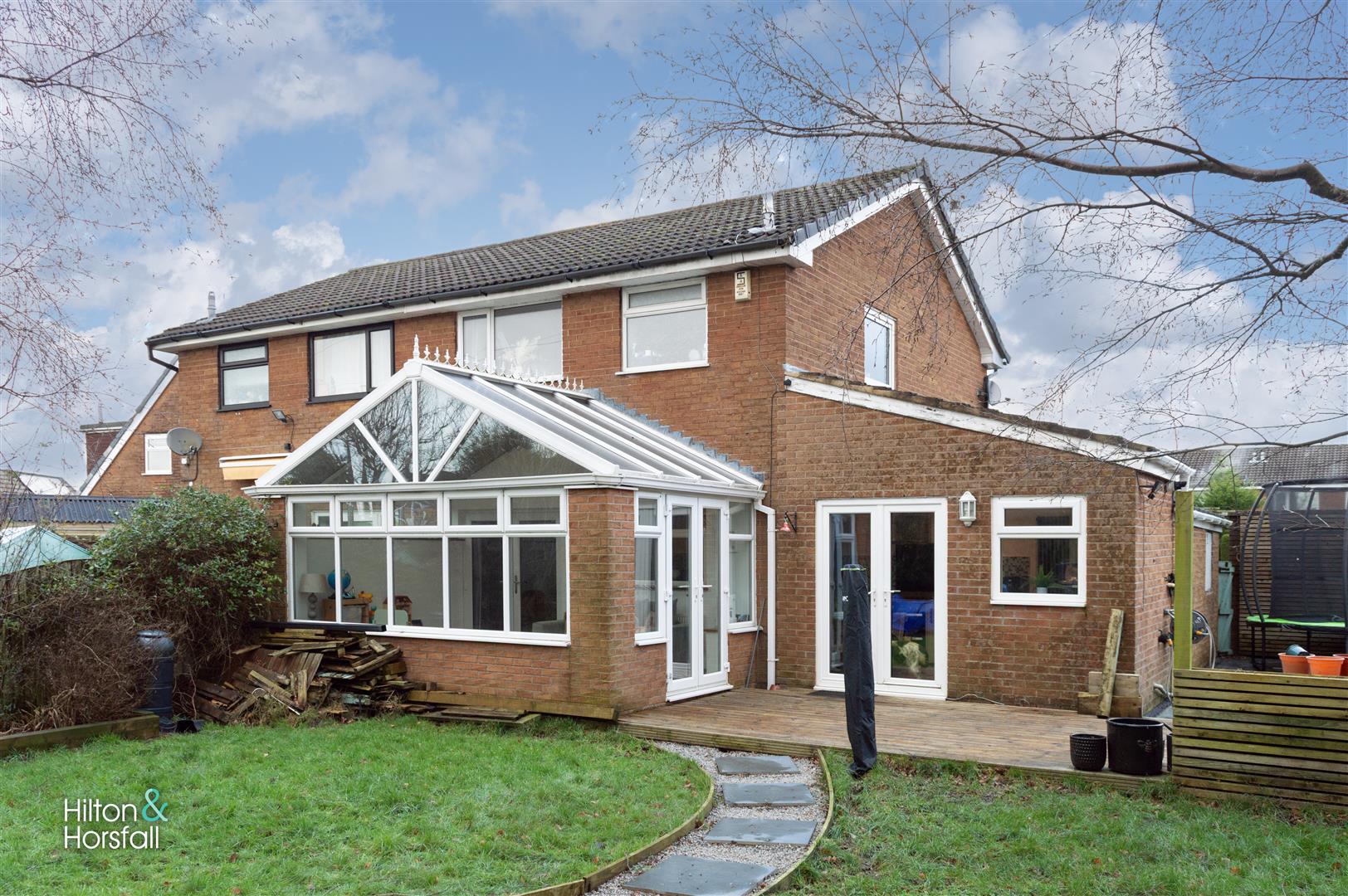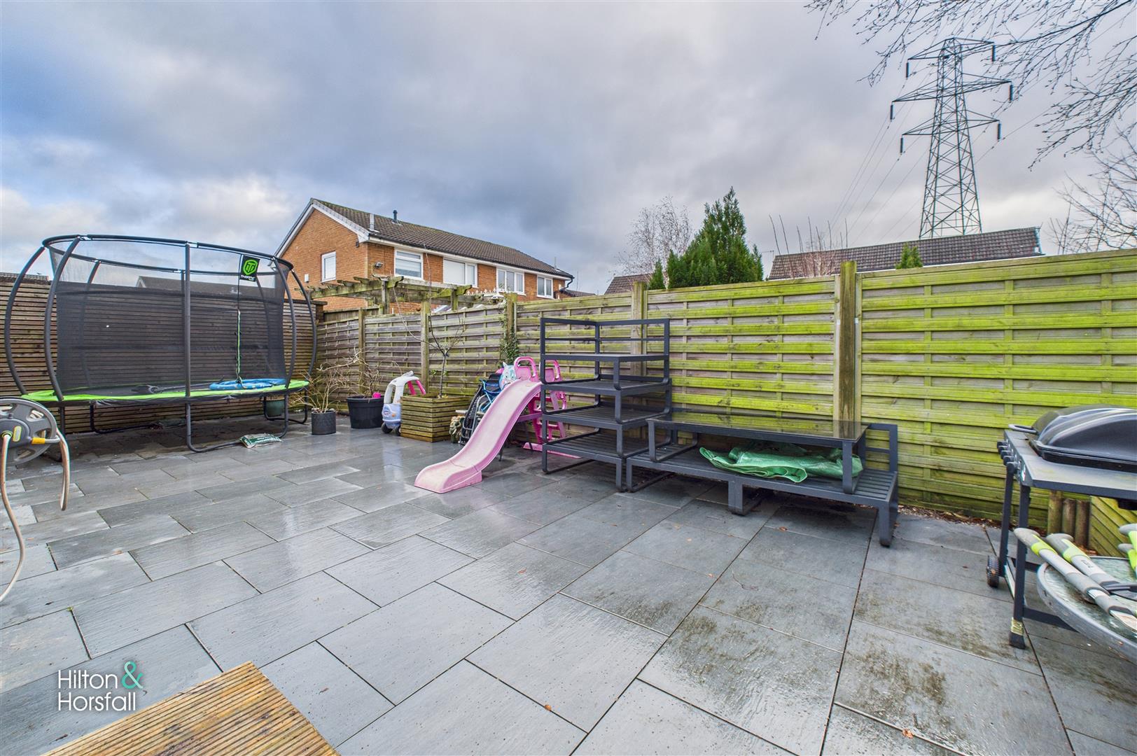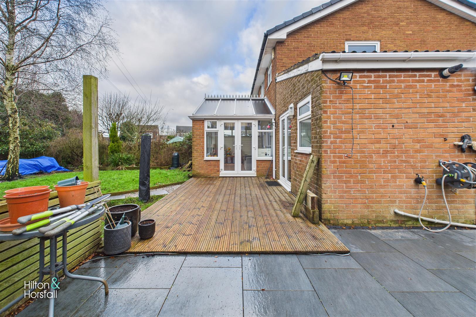 To the front of the property is a long driveway providing ample off-road parking, together with a small lawned garden area. The generous rear garden enjoys a mix of lawn, decking and a large paved patio—ideal for outdoor dining, play equipment or entertaining. Mature trees and planting provide a good degree of privacy, while a winding pathway leads through the garden, making the space both practical and attractive.